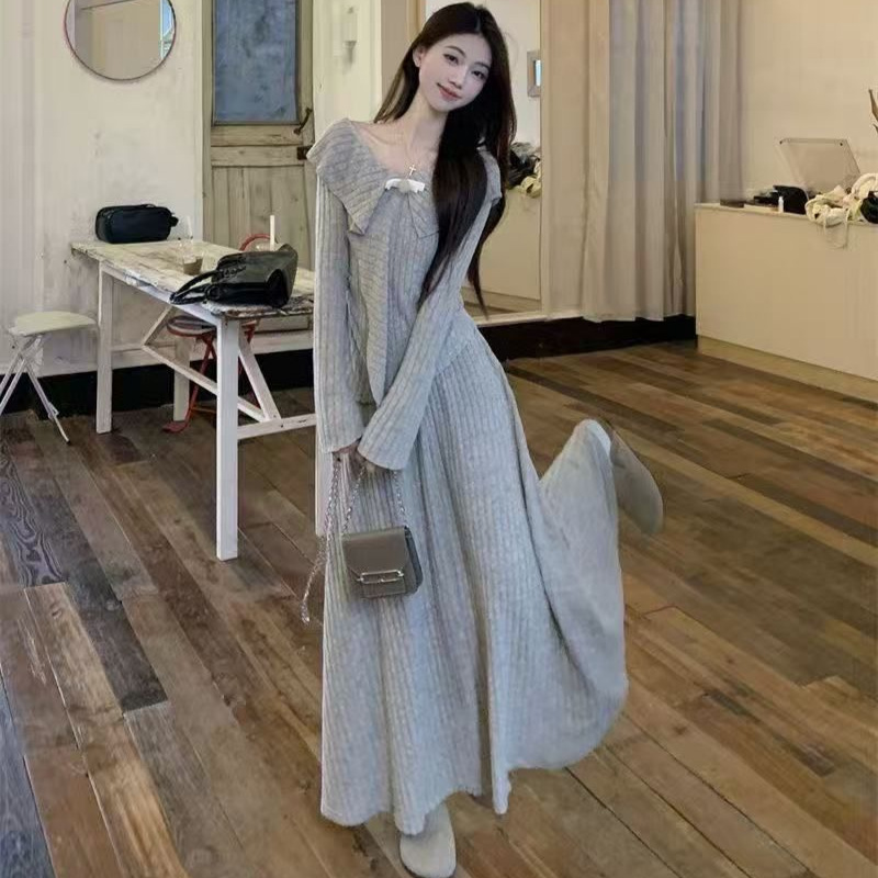 2025新款法式气质内搭针织长袖连衣裙子女秋冬撞色修身设计感长裙