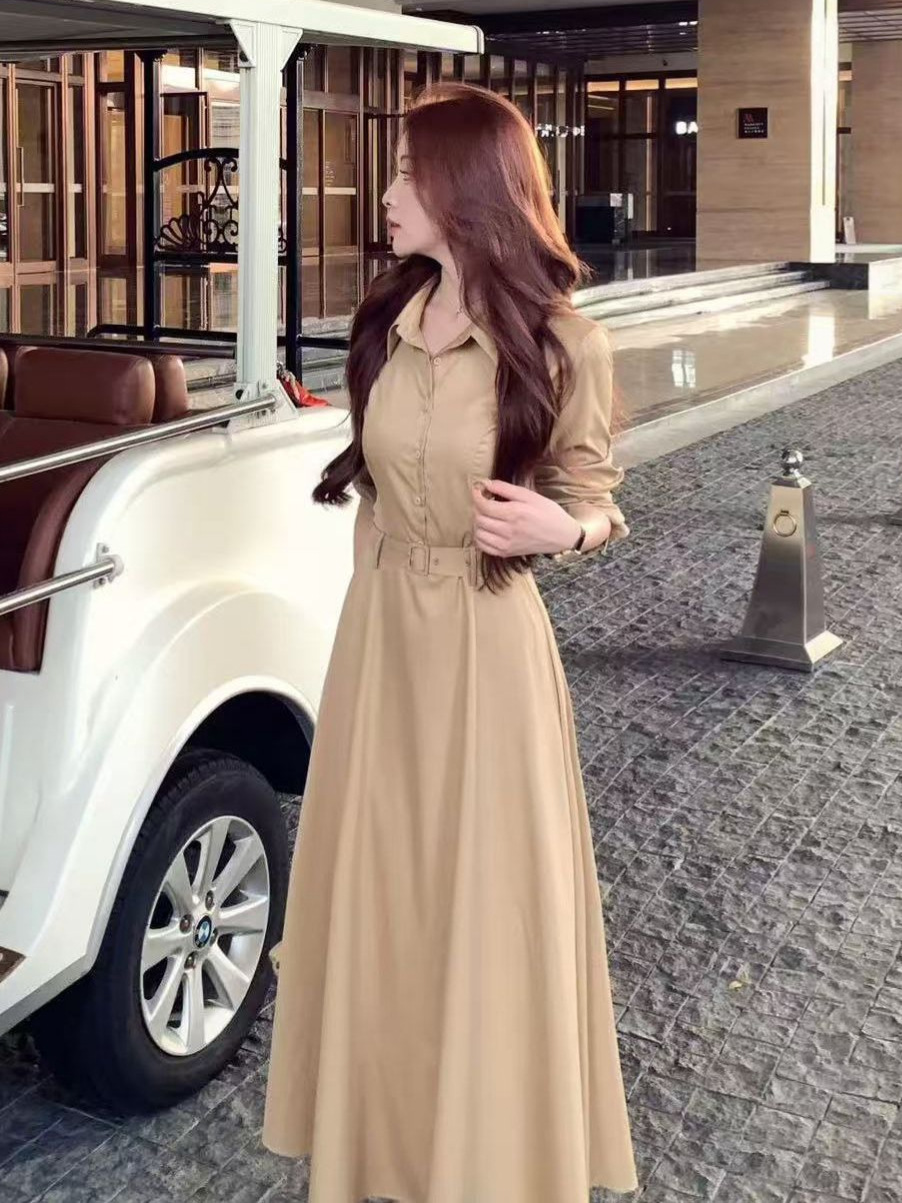 秋冬季新款韩系高级感翻领长袖气质连衣裙配腰带显瘦长款百搭长裙