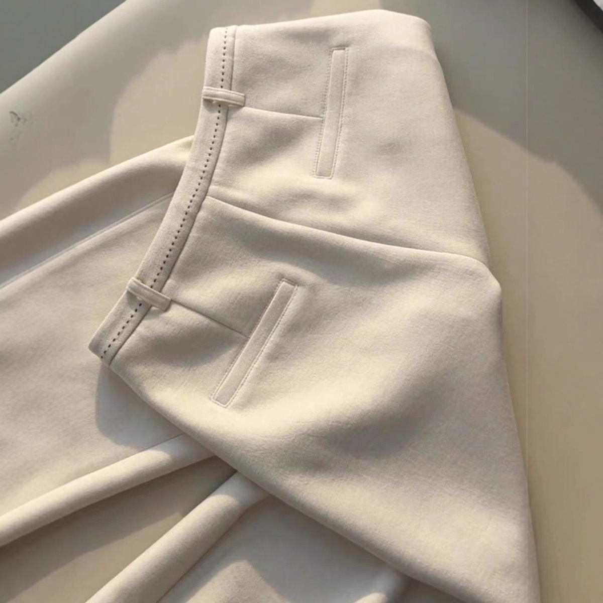 ゆったりとした怠惰なミルクの白い垂直感のあるストレートパンツの女性は腰を緩めてロープを引いて痩せている柔らかいモチモチとしたタオルのワイドパンツを見せている