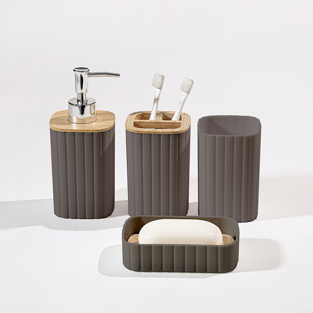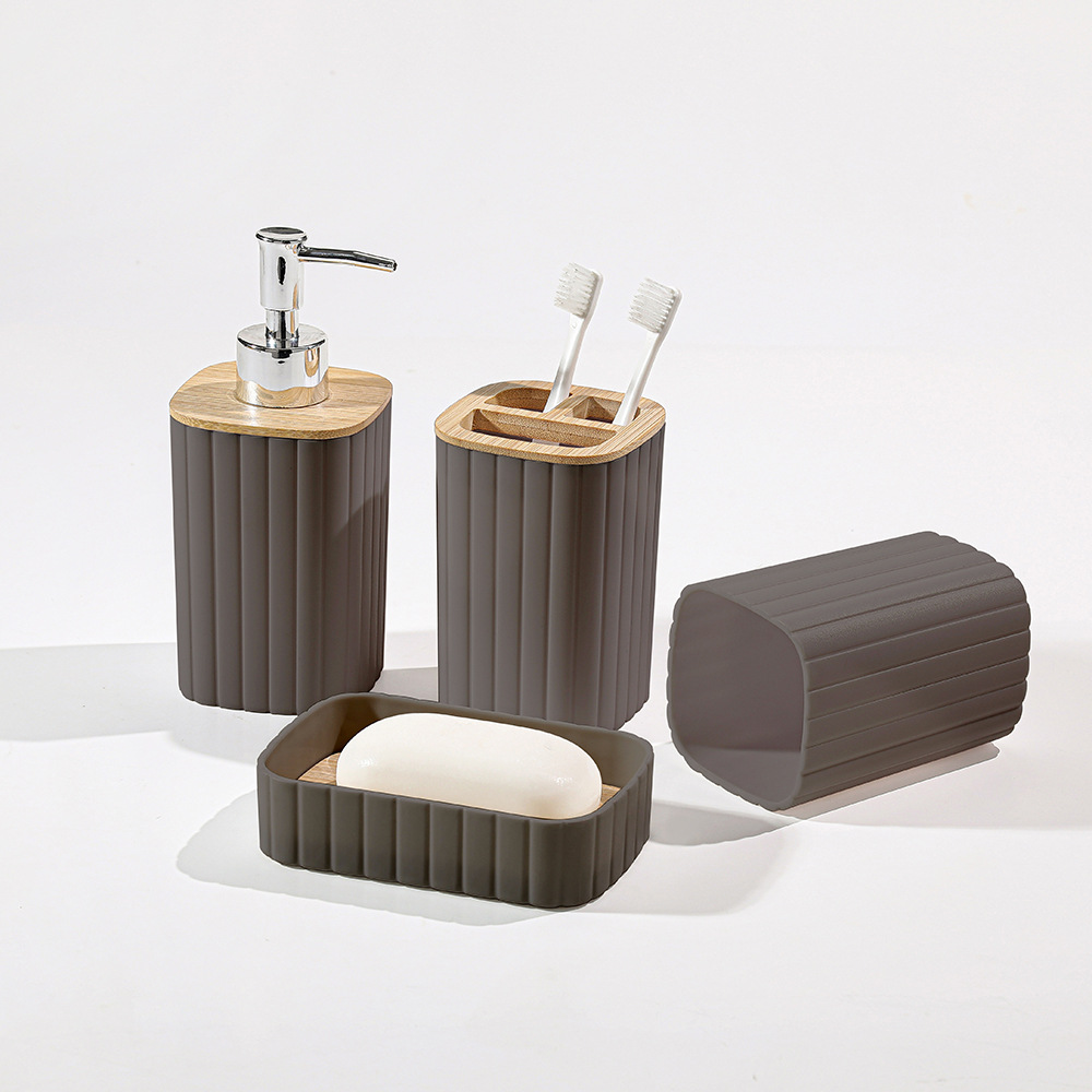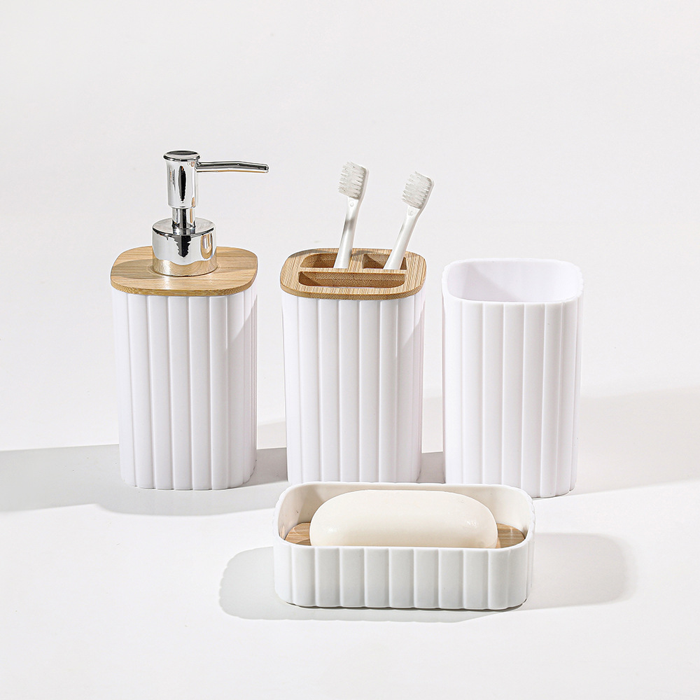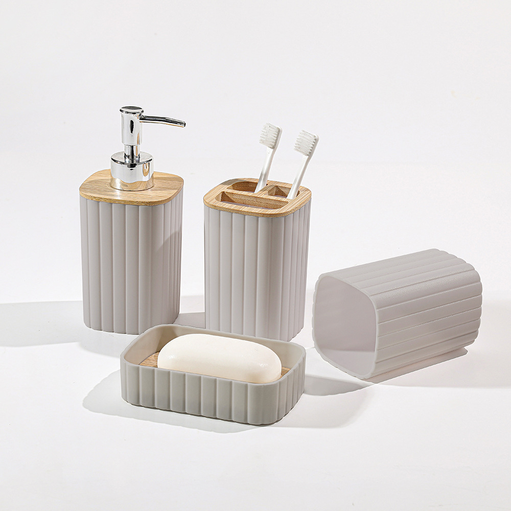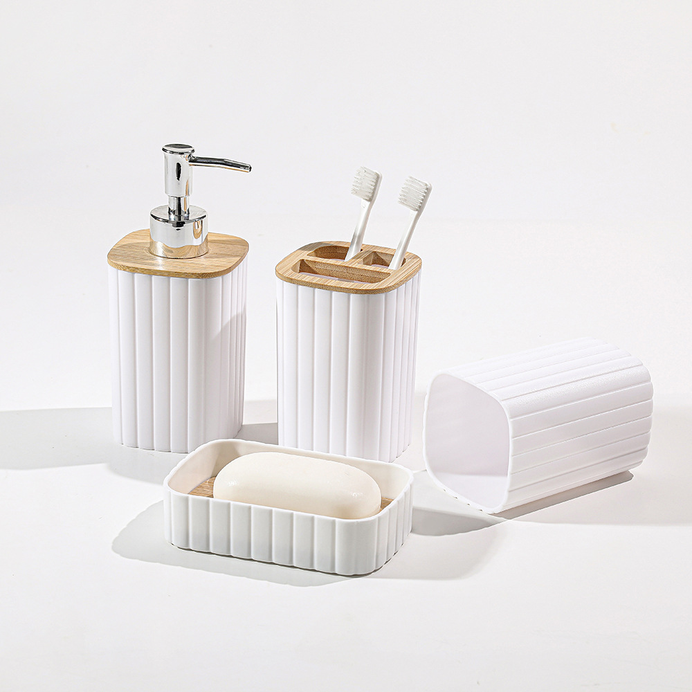 简约条纹塑料浴室洗漱套装酒店民宿木盖乳液瓶漱口杯牙刷杯4件套