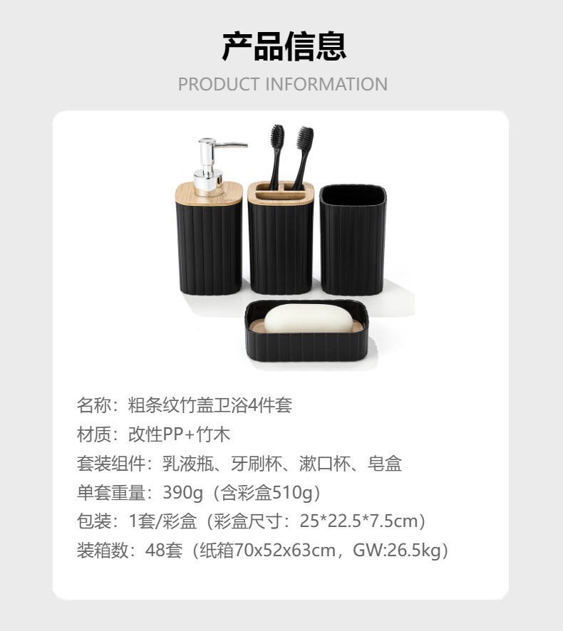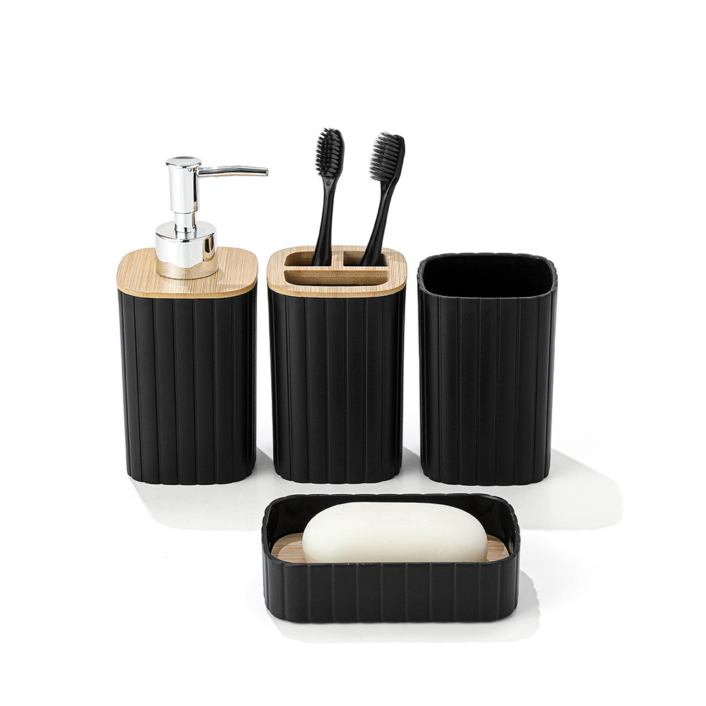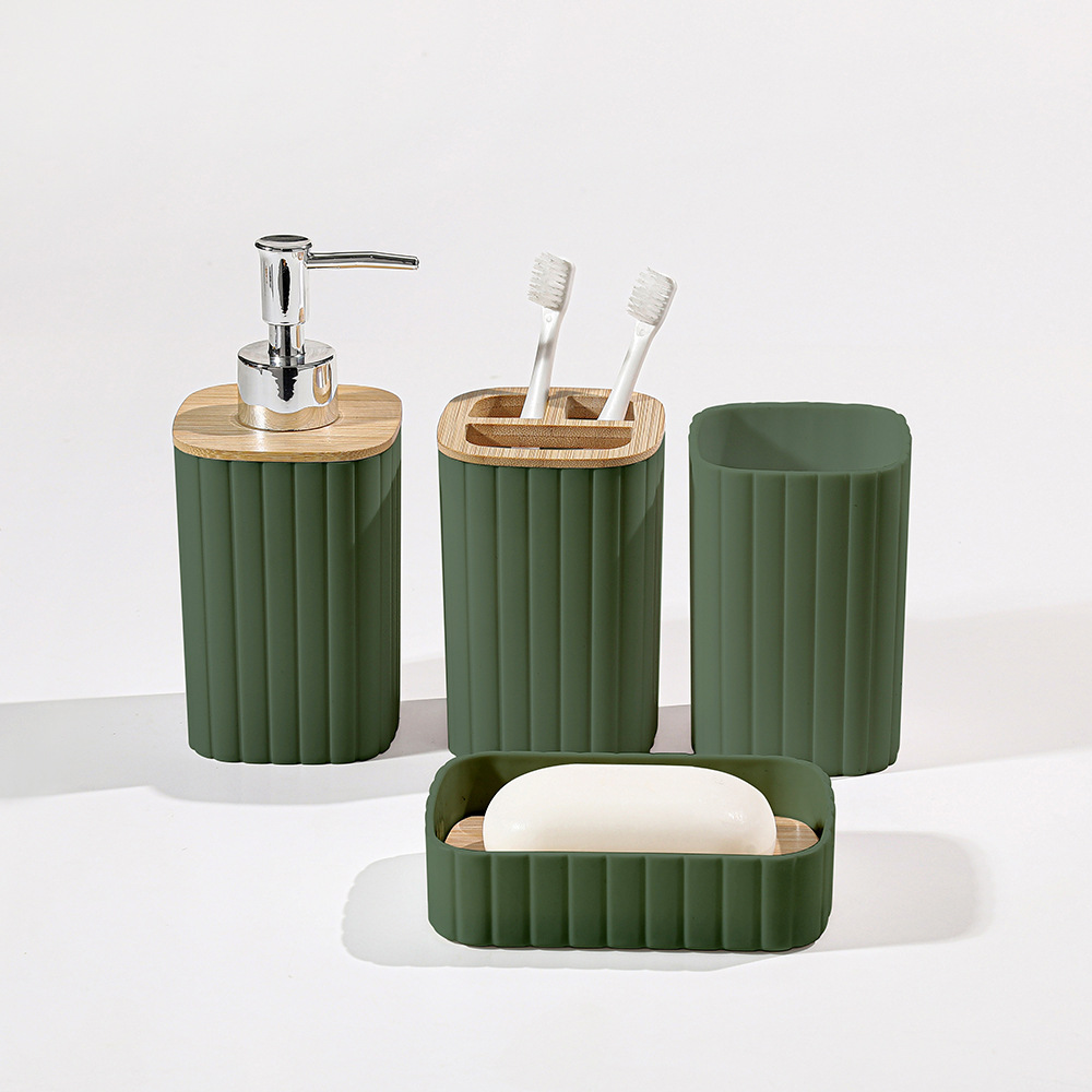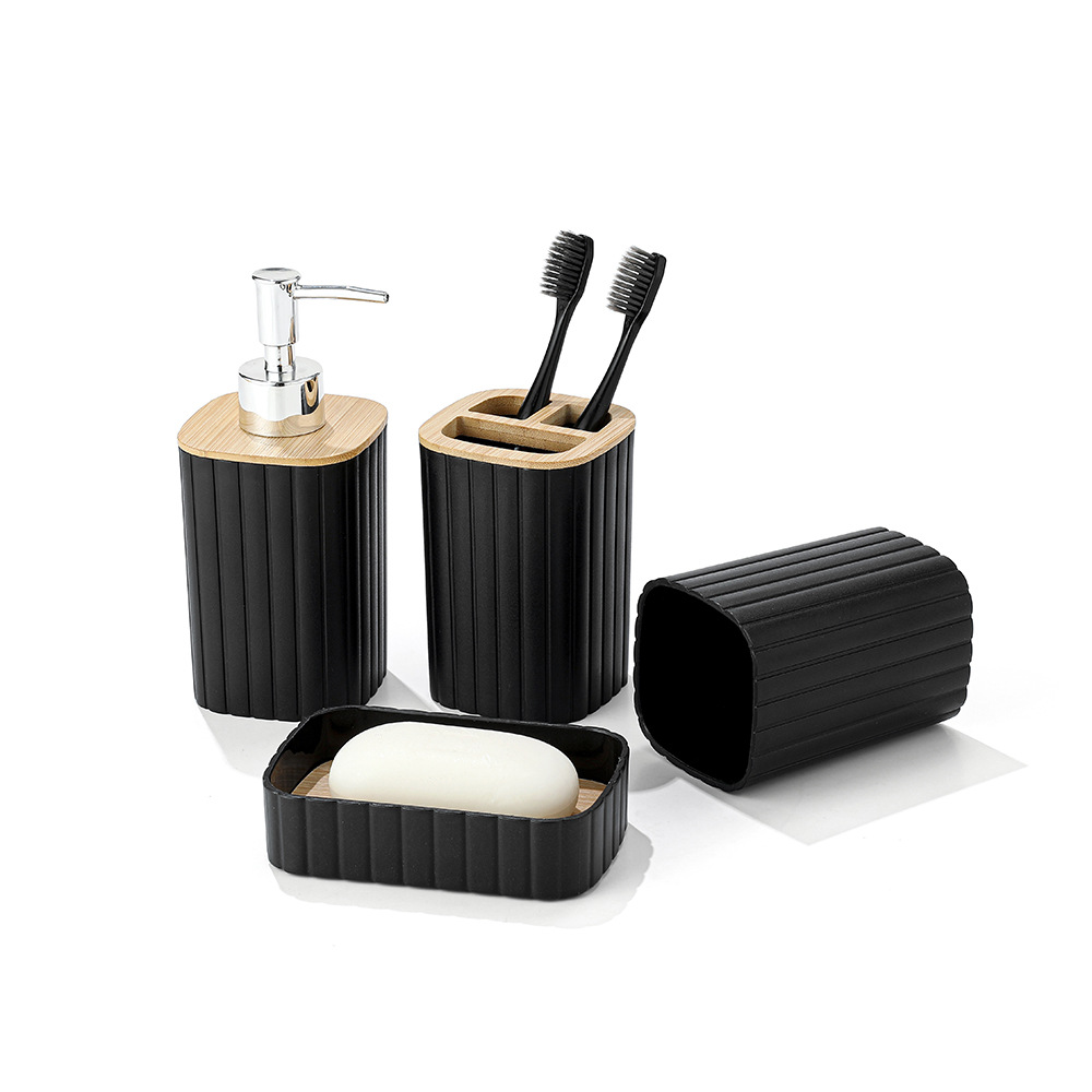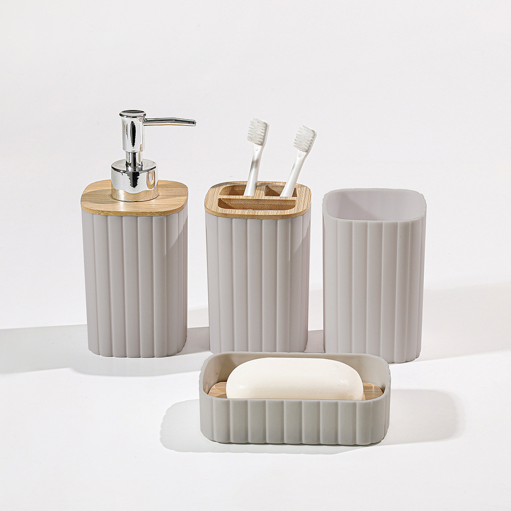简约条纹塑料浴室洗漱套装酒店民宿木盖乳液瓶漱口杯牙刷杯4件套