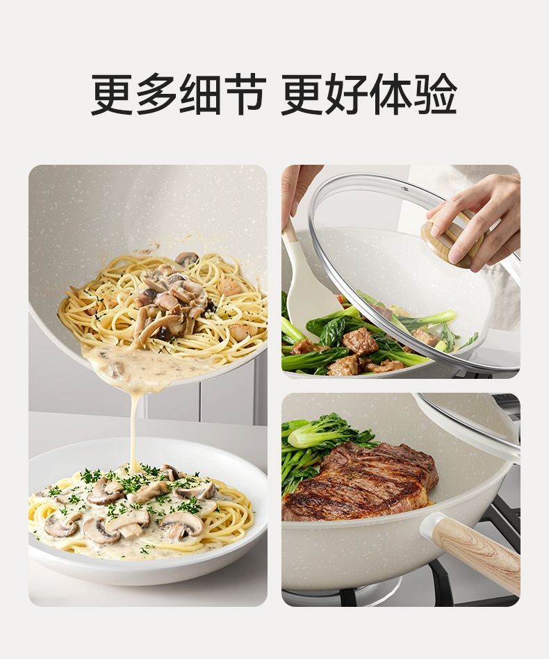 规格 28内外麦饭石白煎炒锅,28内外麦饭石白煎炒锅+钢化盖,30内外麦饭石白煎炒锅,30内外麦饭石白煎炒锅+钢化盖,32内外麦饭石白煎炒锅,32内外麦饭石白煎炒锅+钢化盖