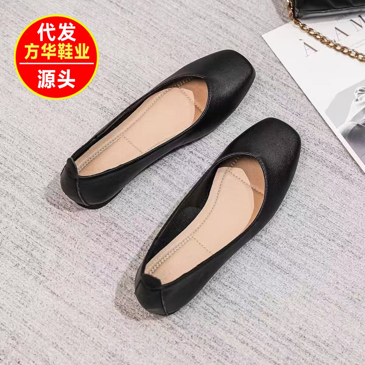 本物のソフトレザーワークシューズ、ブラックスクエアトゥフラットワークウェア、プロフェッショナルワークレザーシューズ、インタビュースチュワーデスの快適なソフトソールシューズ