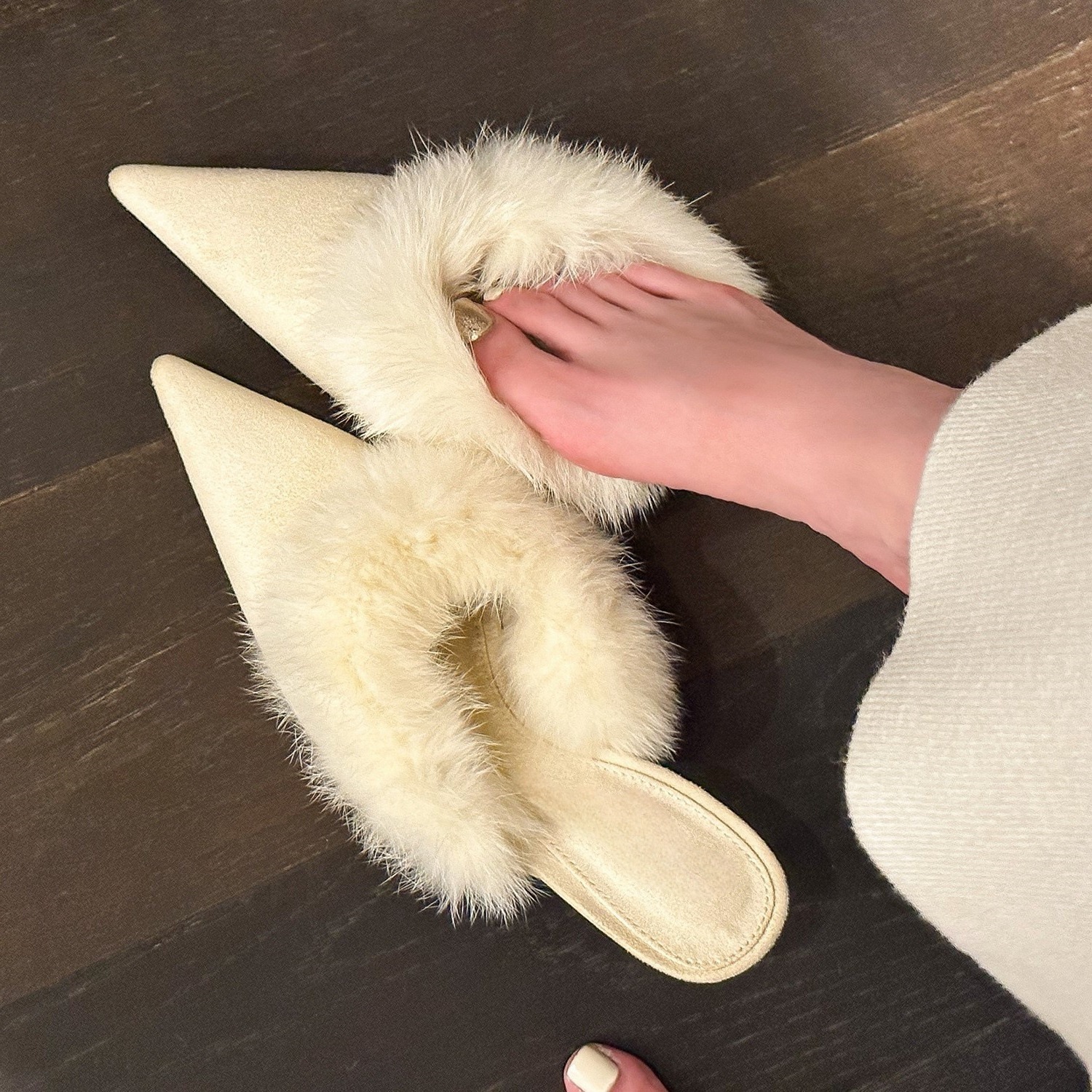 奶糯叽叽!温柔毛毛尖头拖鞋女2024冬季包头高跟鞋子米白色黑色