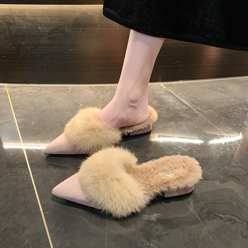2025秋冬新款小猫跟尖头毛毛半拖鞋外穿包头真毛小矮跟穆勒包头拖