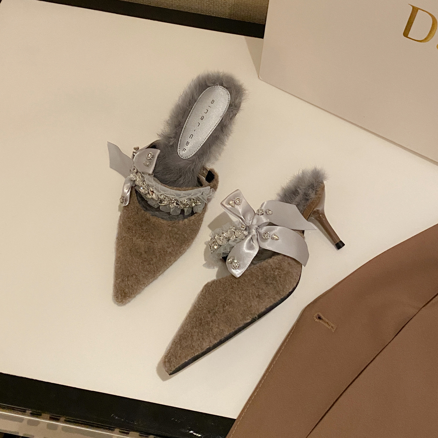 53016 高跟拖鞋女细跟2026年毛绒包头兔毛半拖鞋尖头蝴蝶结毛毛鞋