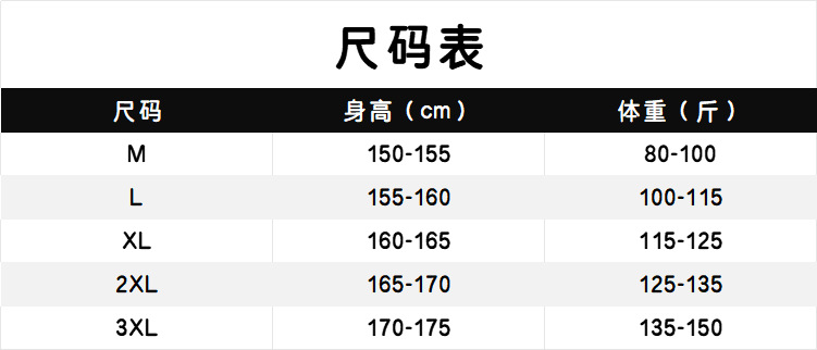 M(【建议80-100斤】),L(【建议100-115斤】),XL(【建议115-125斤】),2XL(【建议125-135斤】),3XL(【建议135-150斤】)
