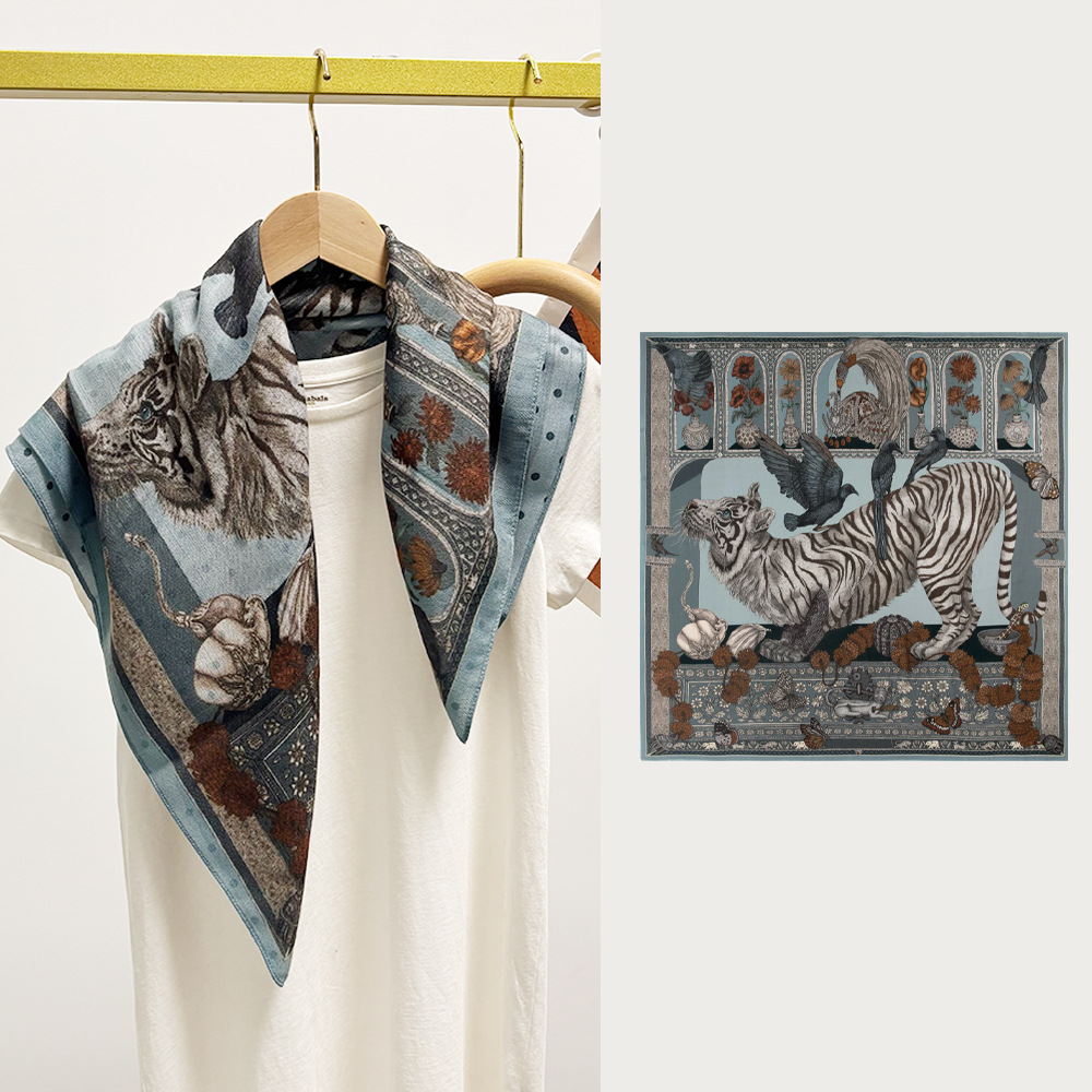 2025秋冬季复古仿丝毛围巾真丝动物虎65cm方巾披肩女百搭气质