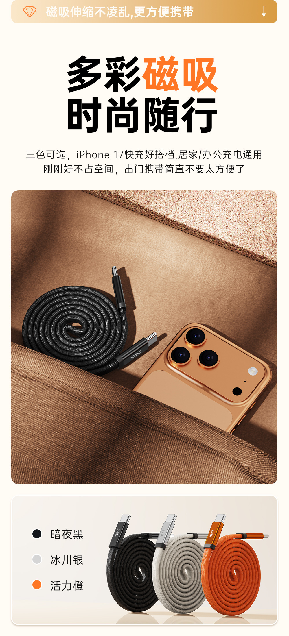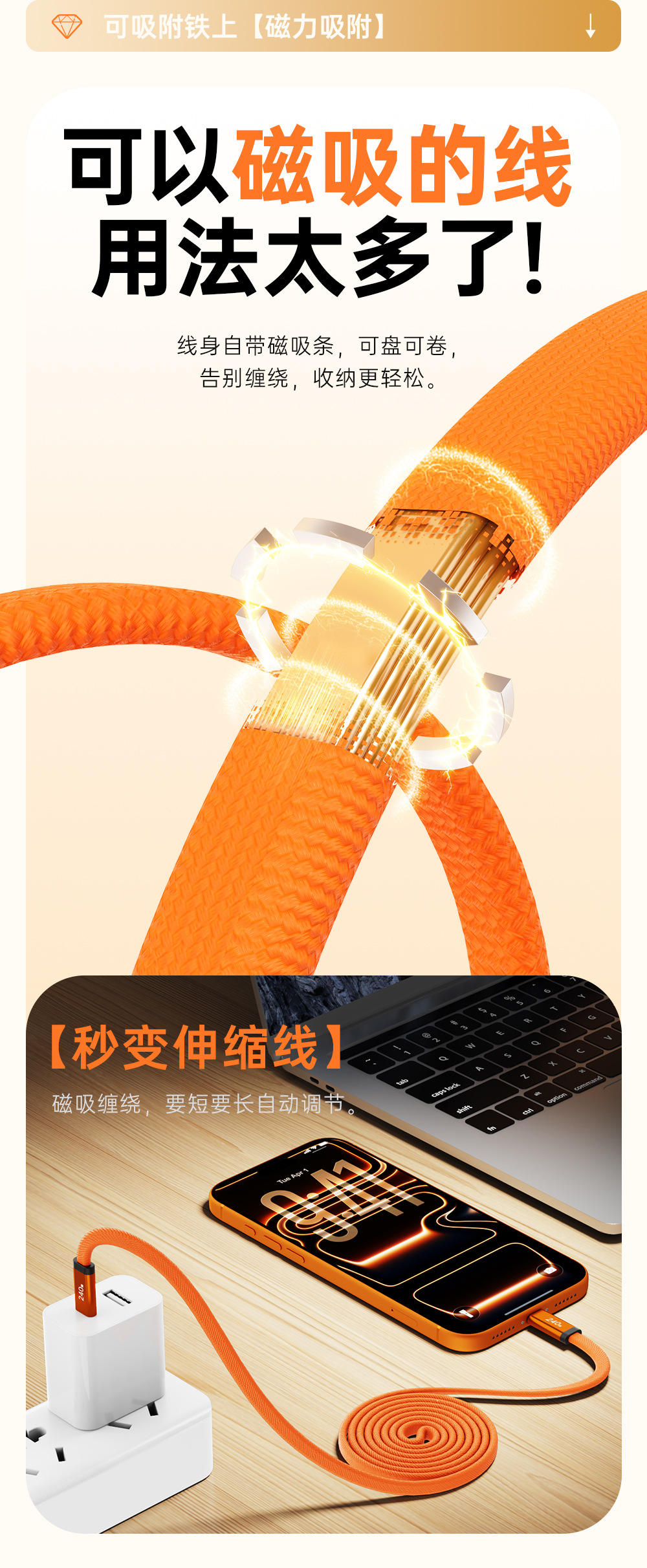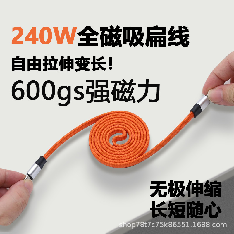 源头工厂240W磁吸数据线编织伸缩快充扁线适用苹果17平板华为小米