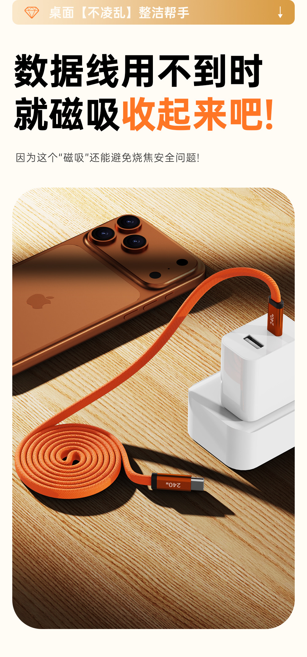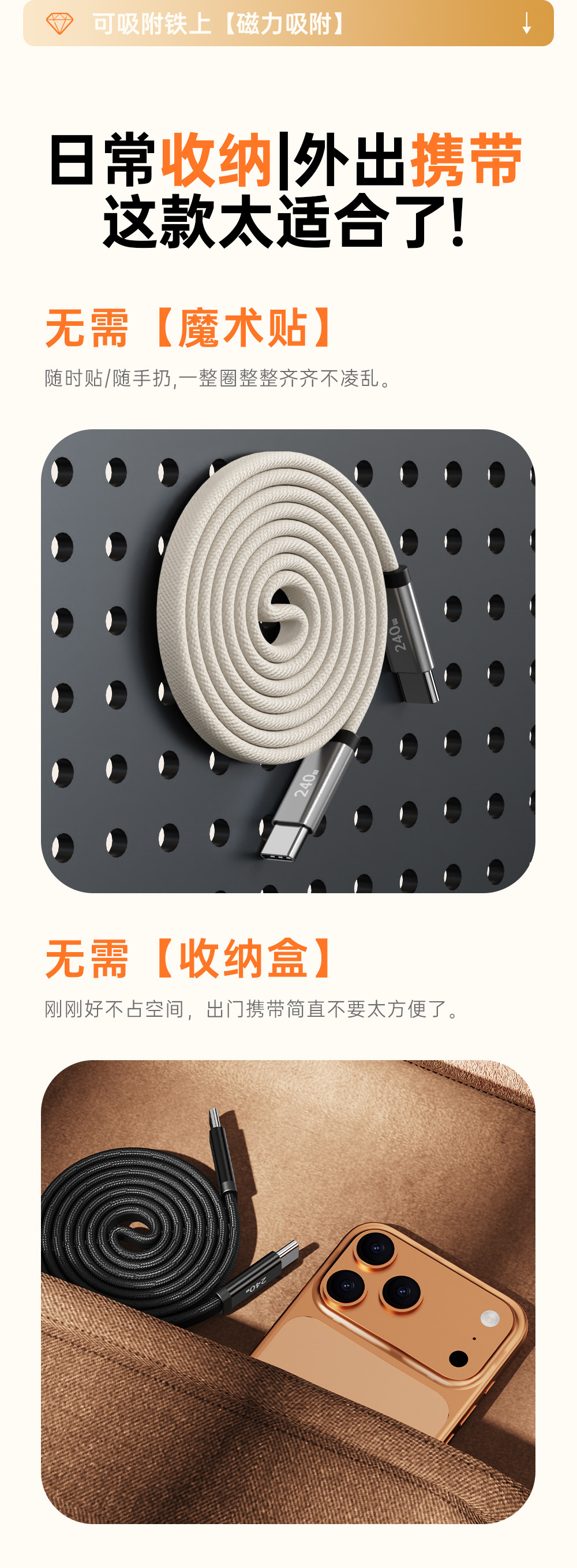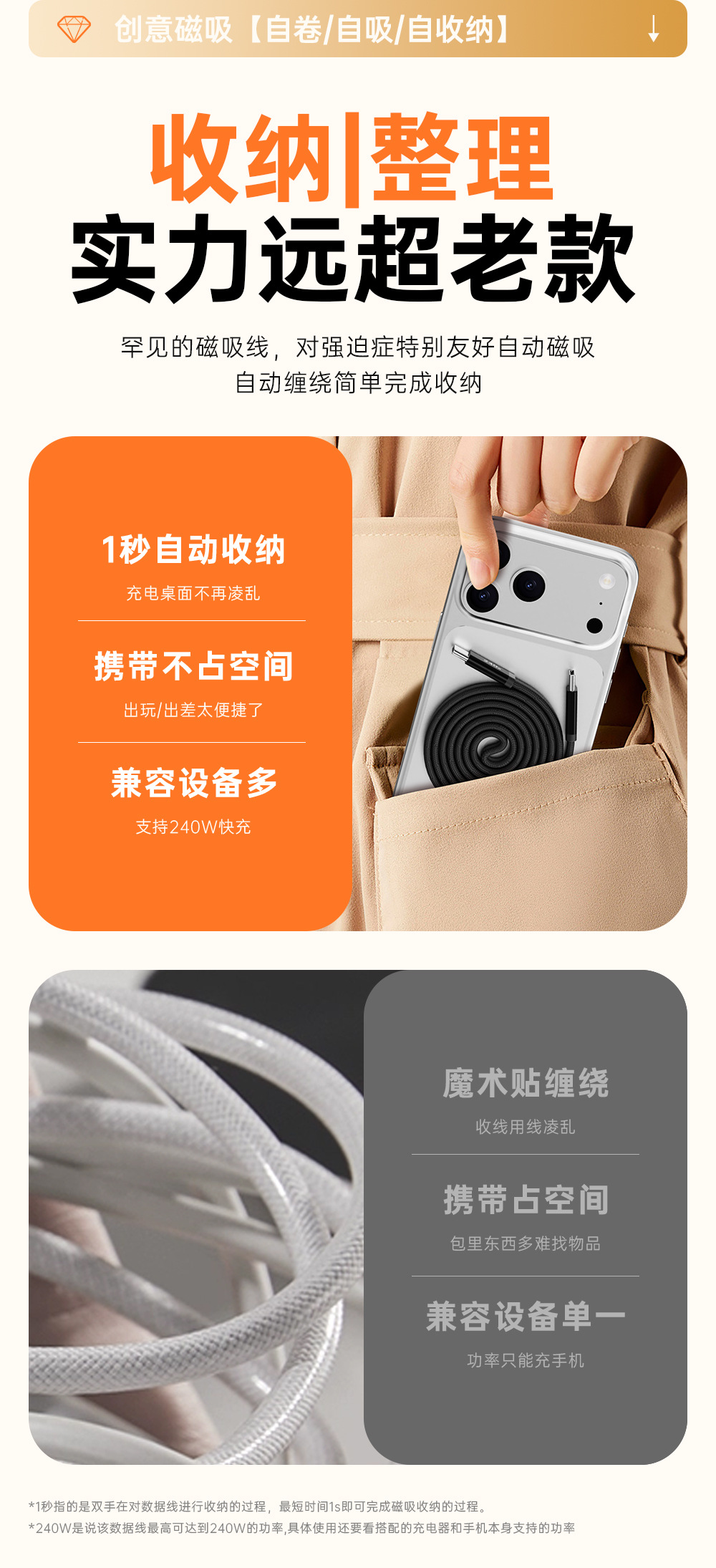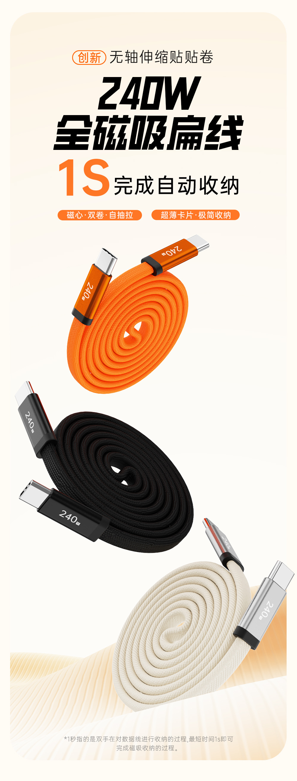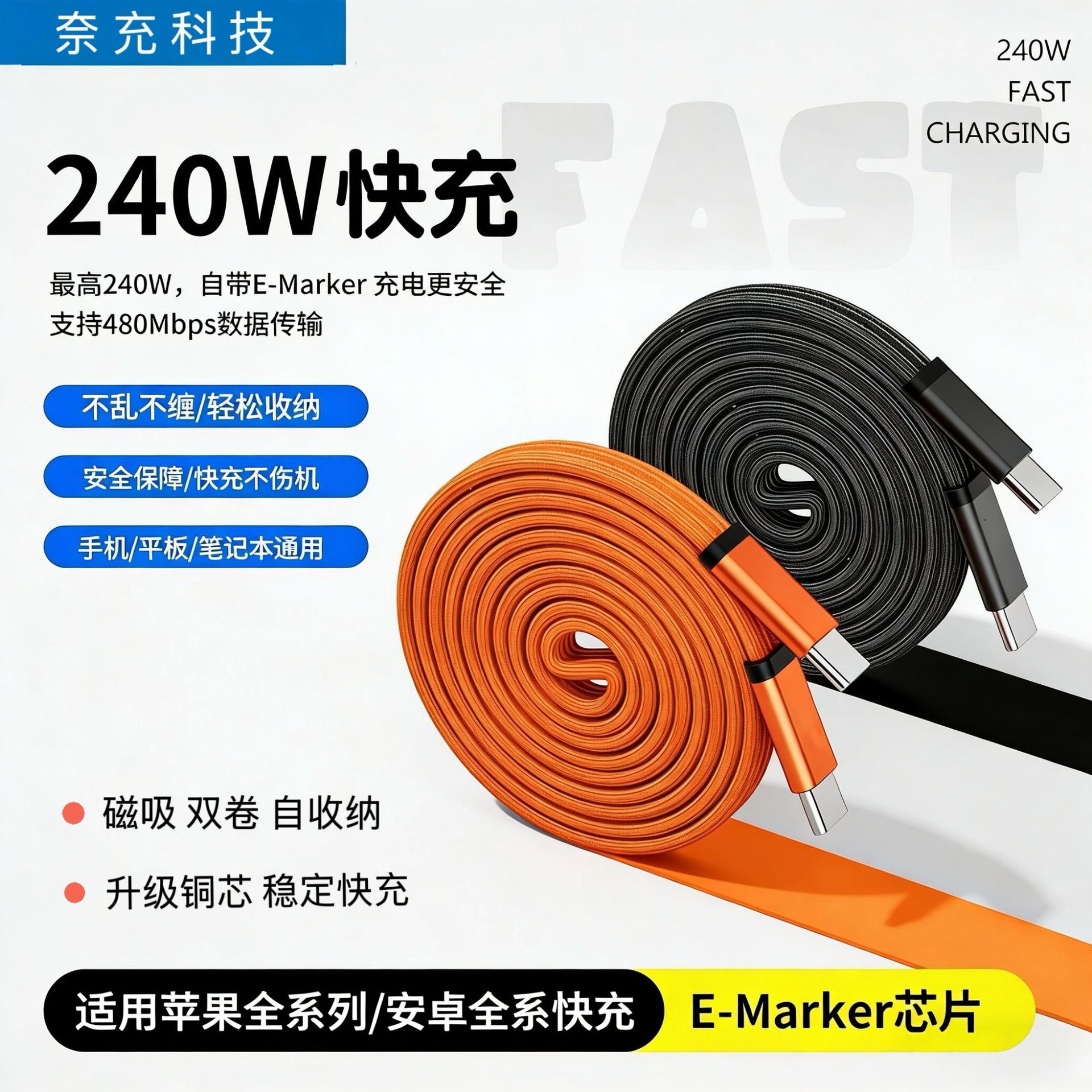 【工厂直销】240W超级快充双卷磁吸收纳扁线适用苹果17安卓type-c