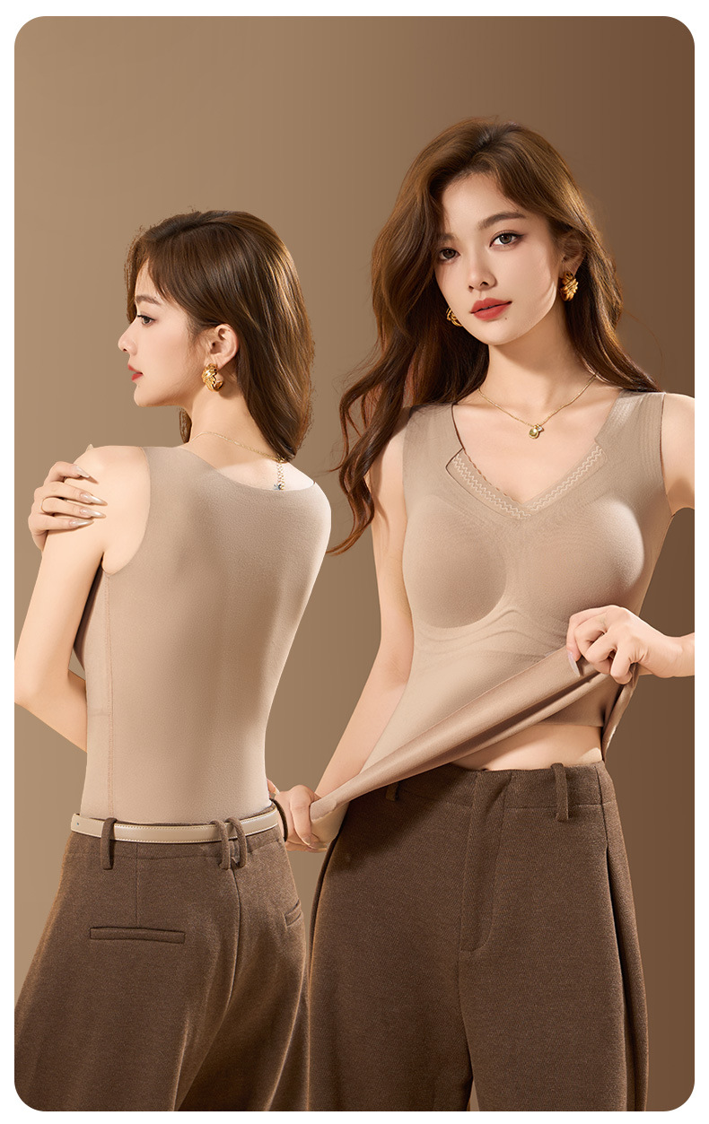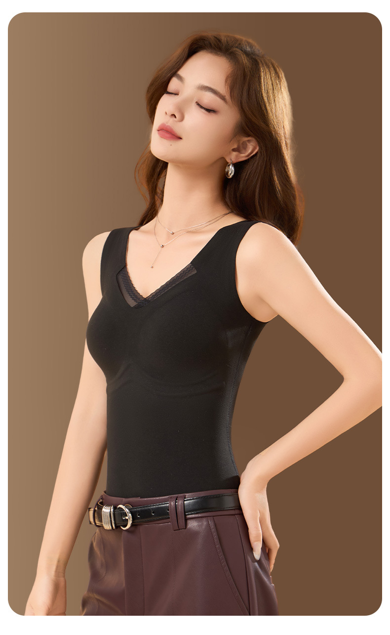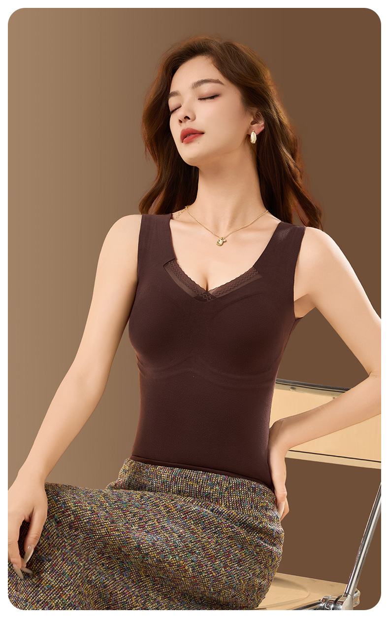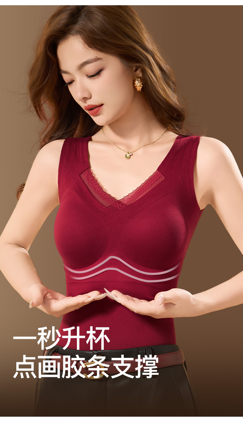 秋冬蕾丝V领保暖内衣女发热舒适修身聚拢保暖背心一体固定杯上衣