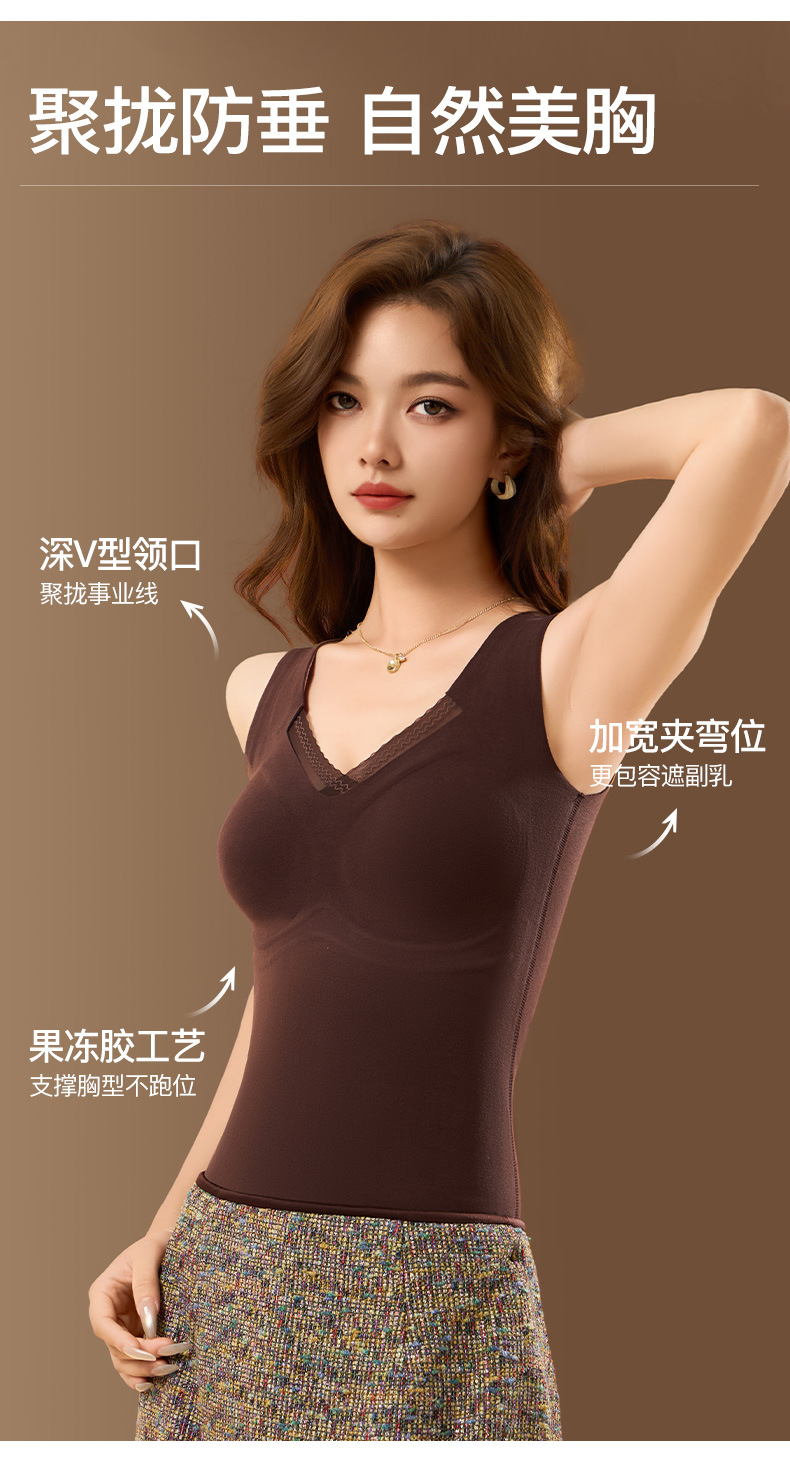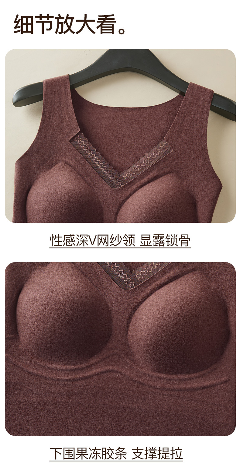 秋冬新款V领蕾丝保暖背心一体固定杯无痕免穿文胸软支撑保暖马甲