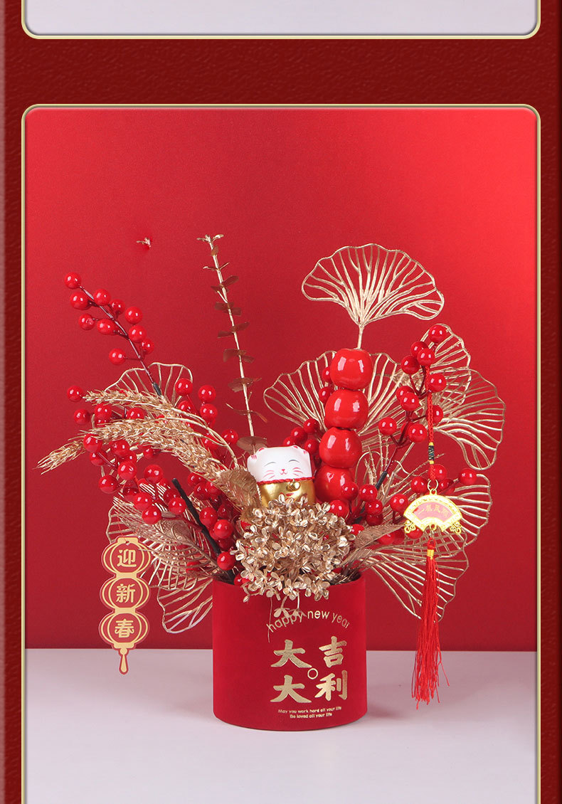 新年の福の桶は桶の赤い花の桶の花の筒の花屋を抱いて花の綿布を挿して金持ちになります。