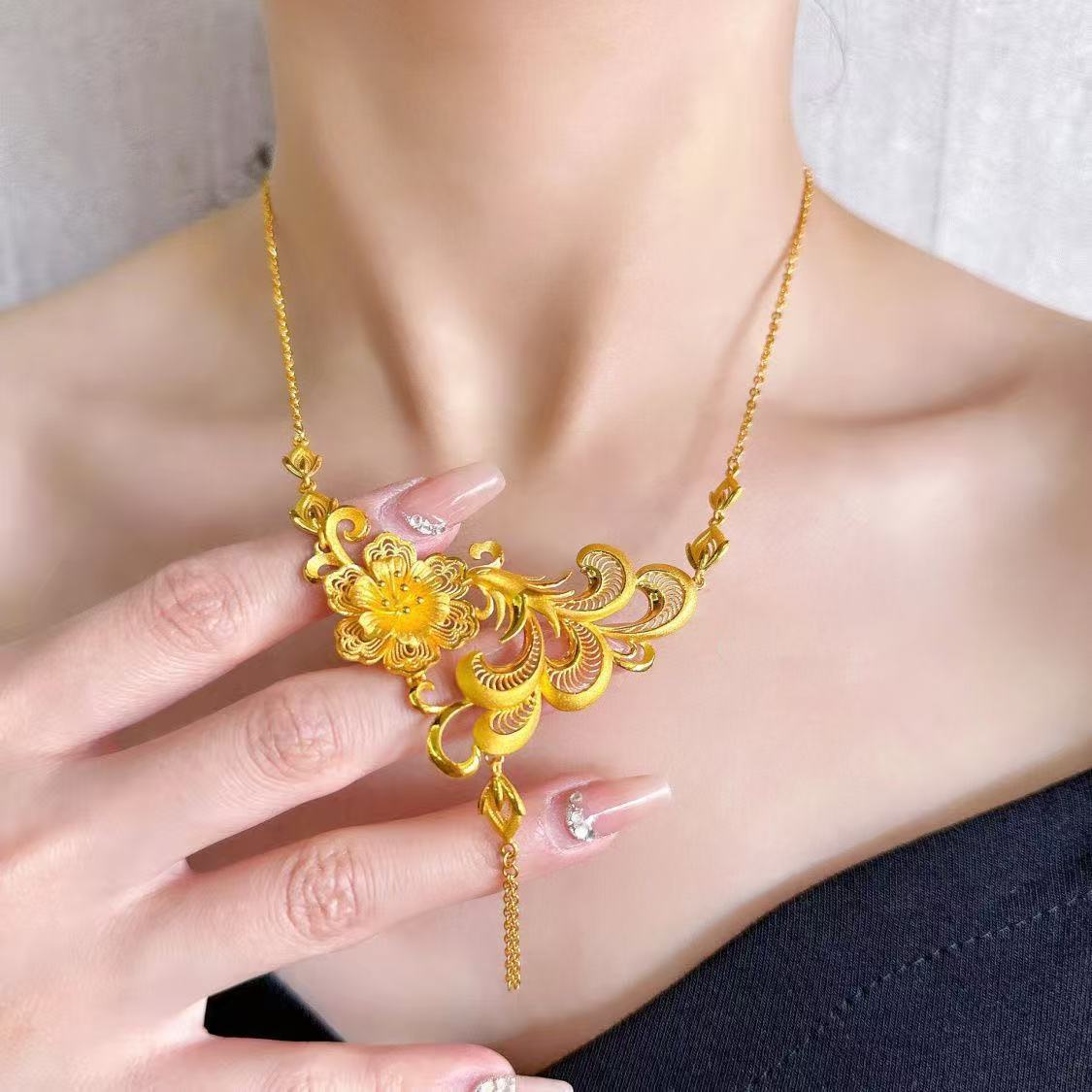 黄金色古法凤凰富贵花项链女大气轻奢高级感新款结婚喜庆项链礼物