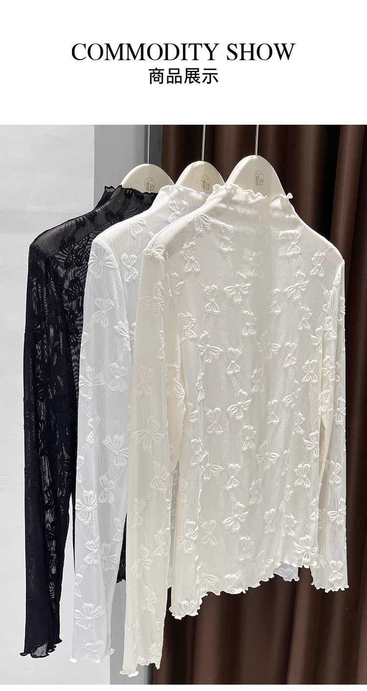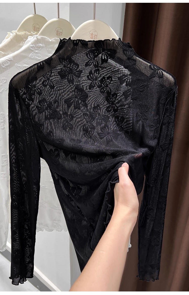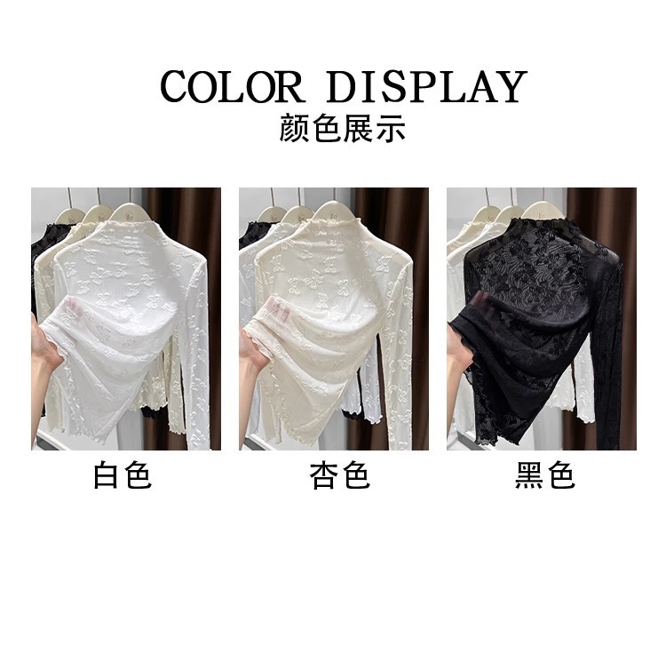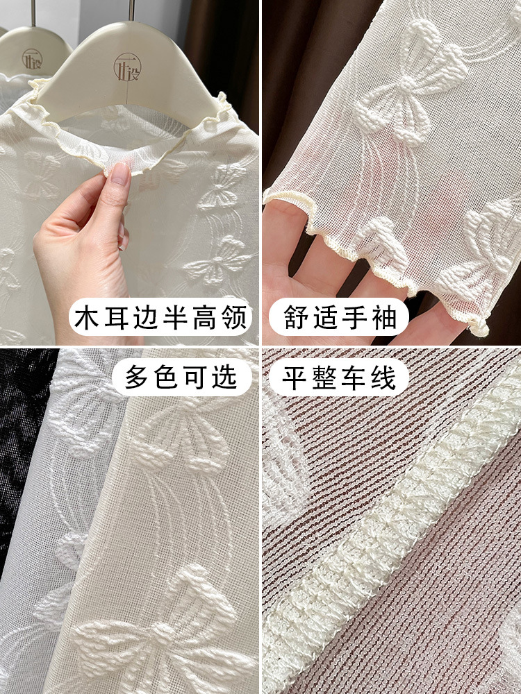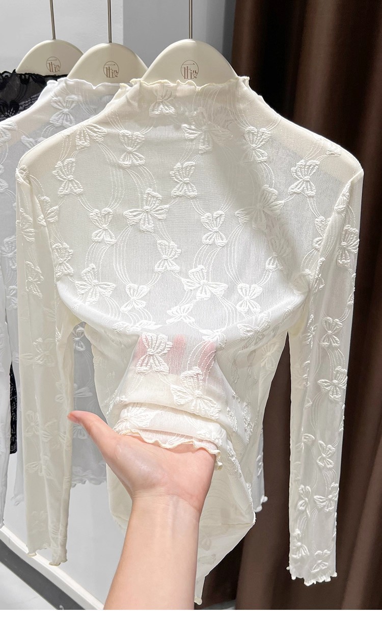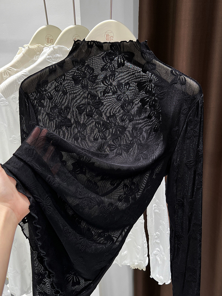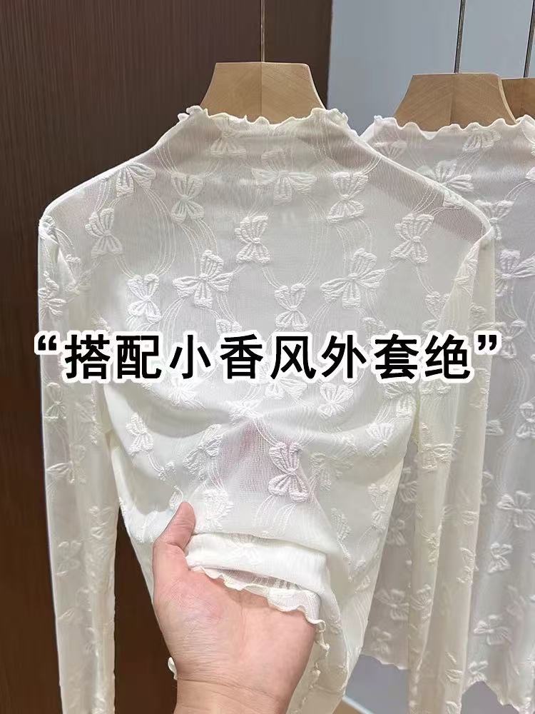 2025年新品边半高领薄纱打底衫女网纱长袖内搭春新款提花蕾丝上衣