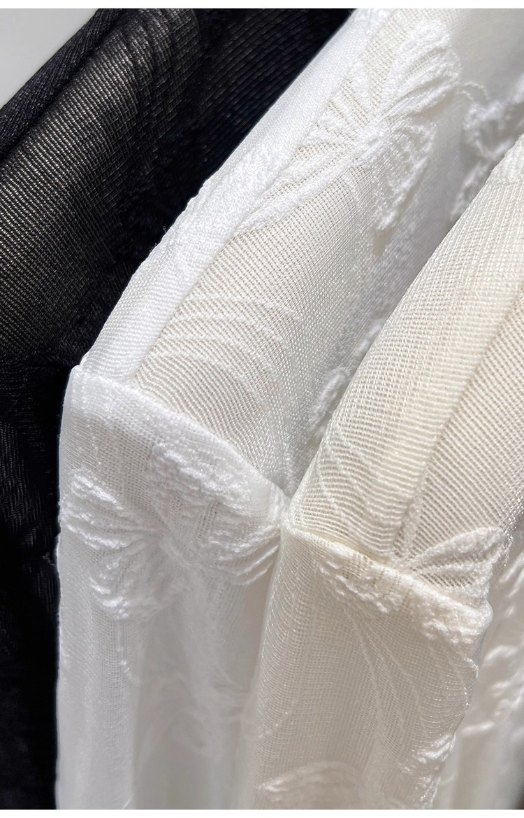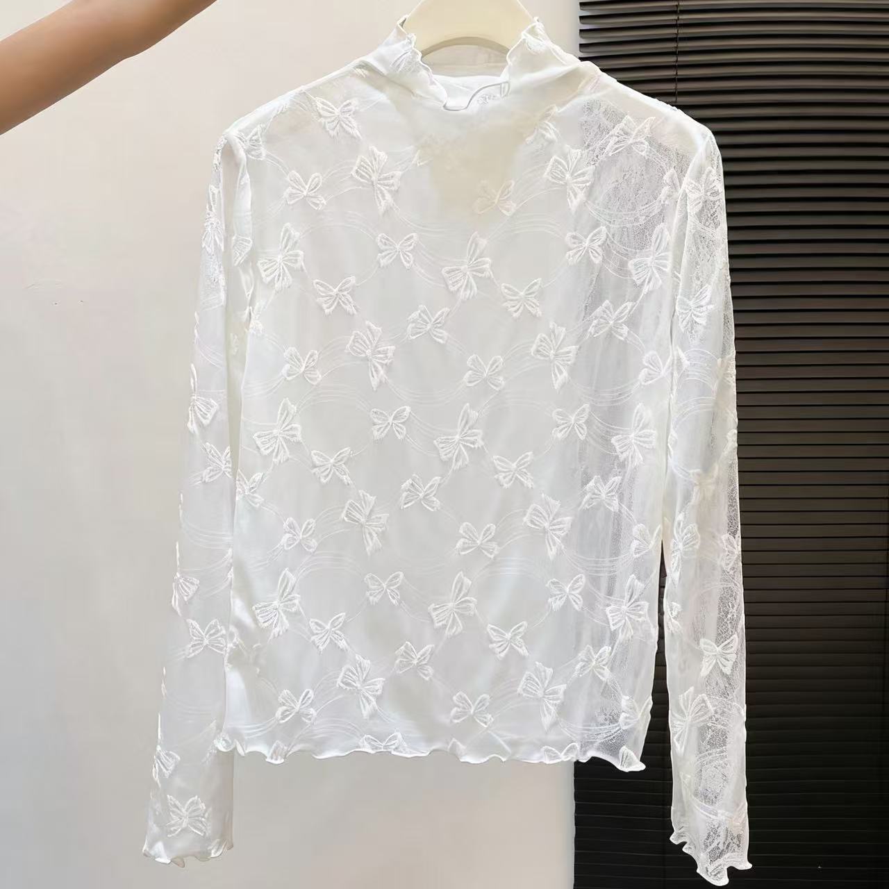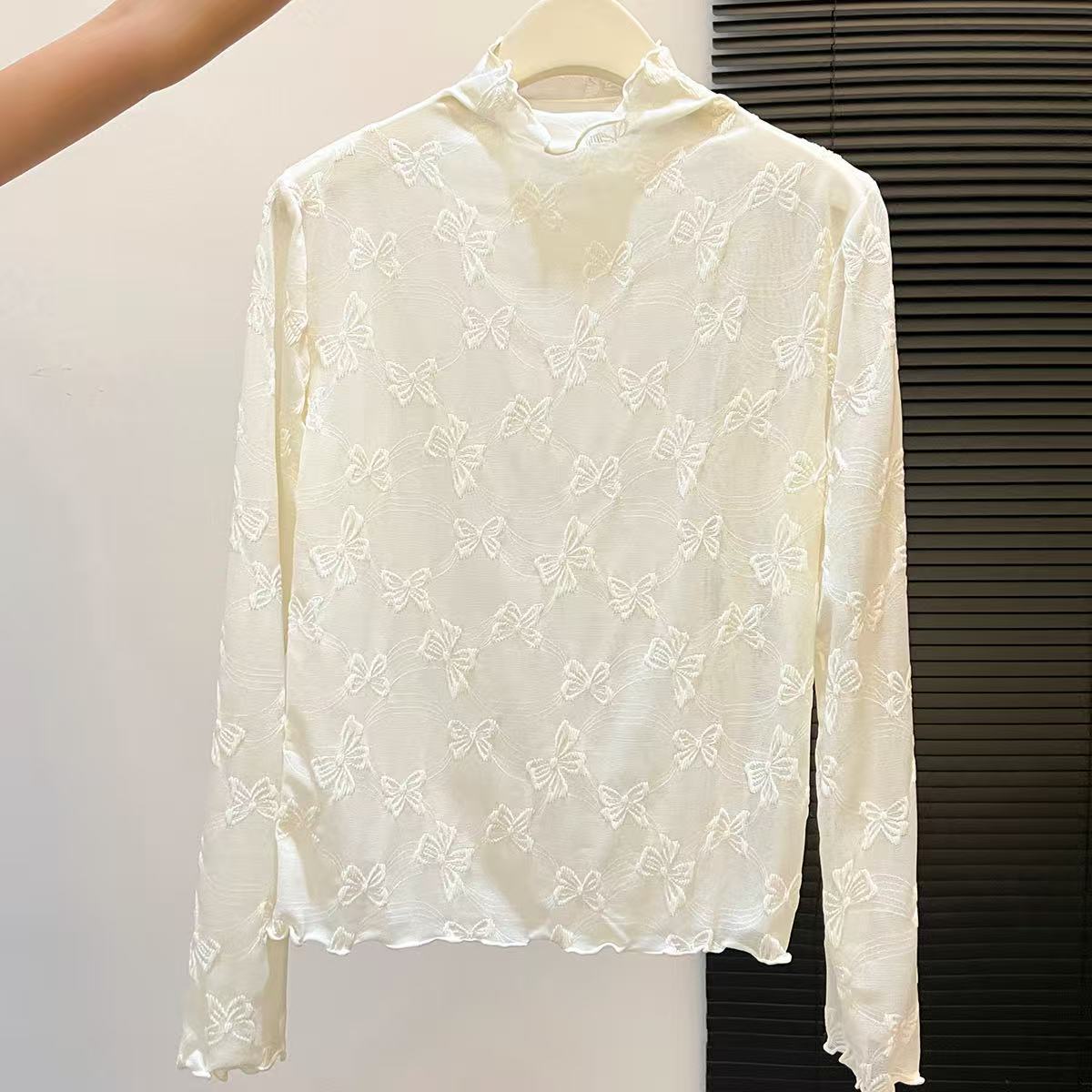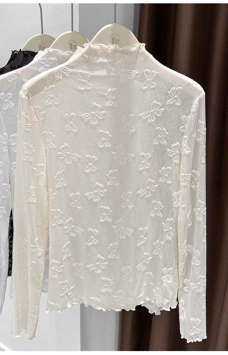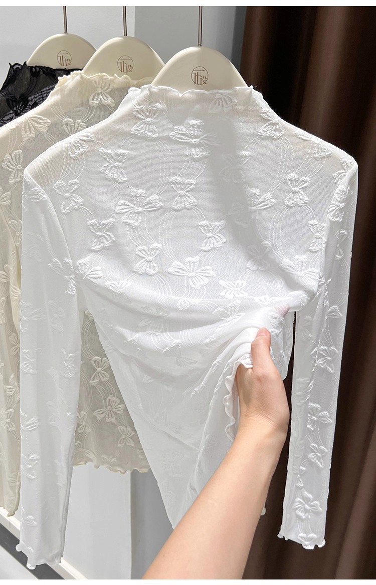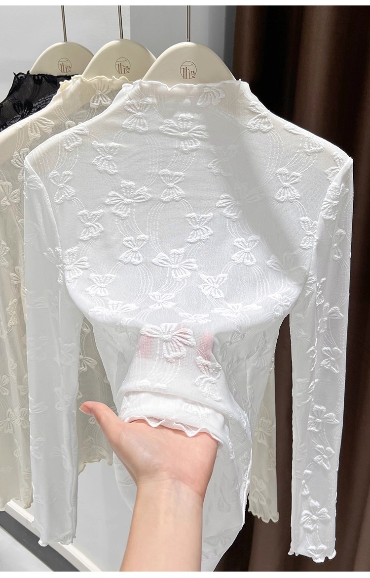 2025年新品边半高领薄纱打底衫女网纱长袖内搭春新款提花蕾丝上衣