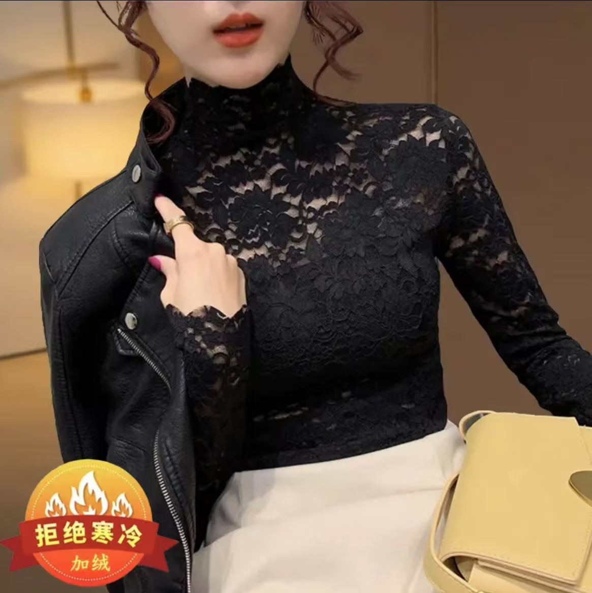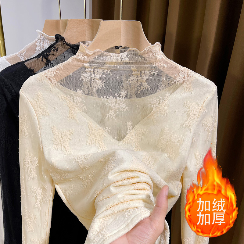 加绒加厚蕾丝打底衫女秋冬新款半高领长袖木耳领内搭洋气显瘦纱衣