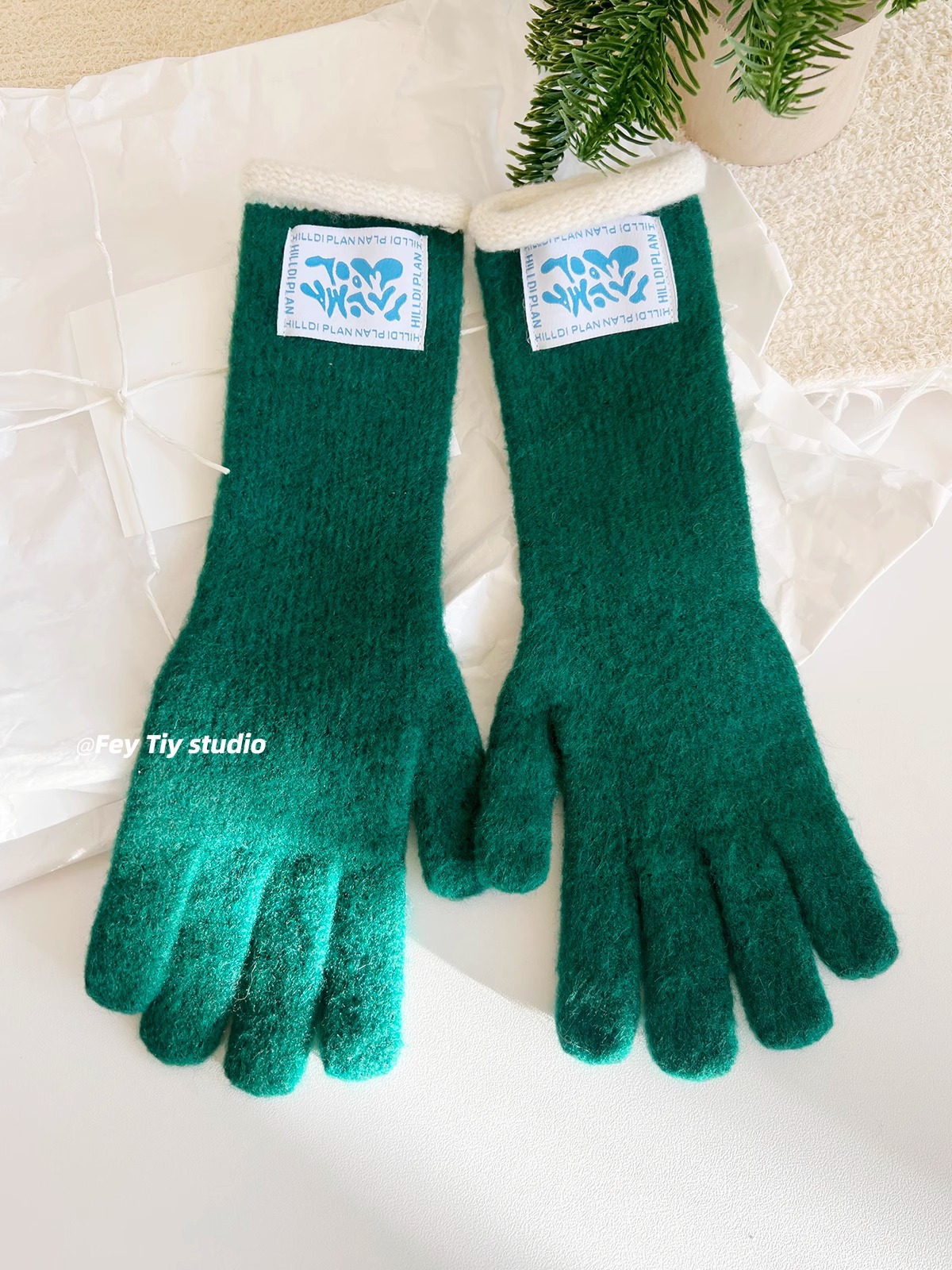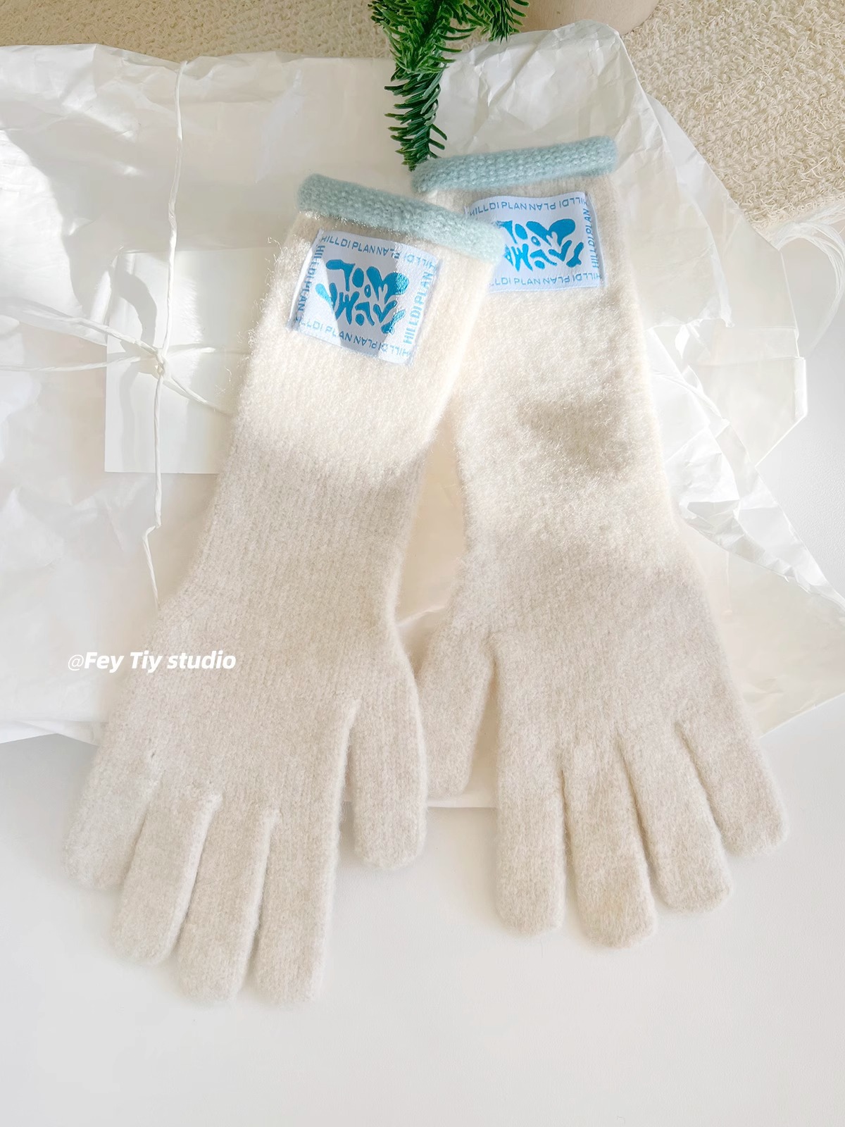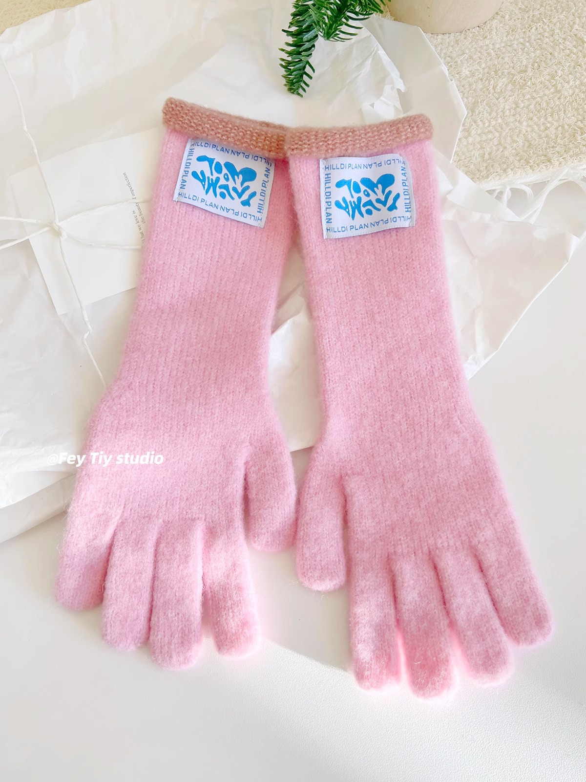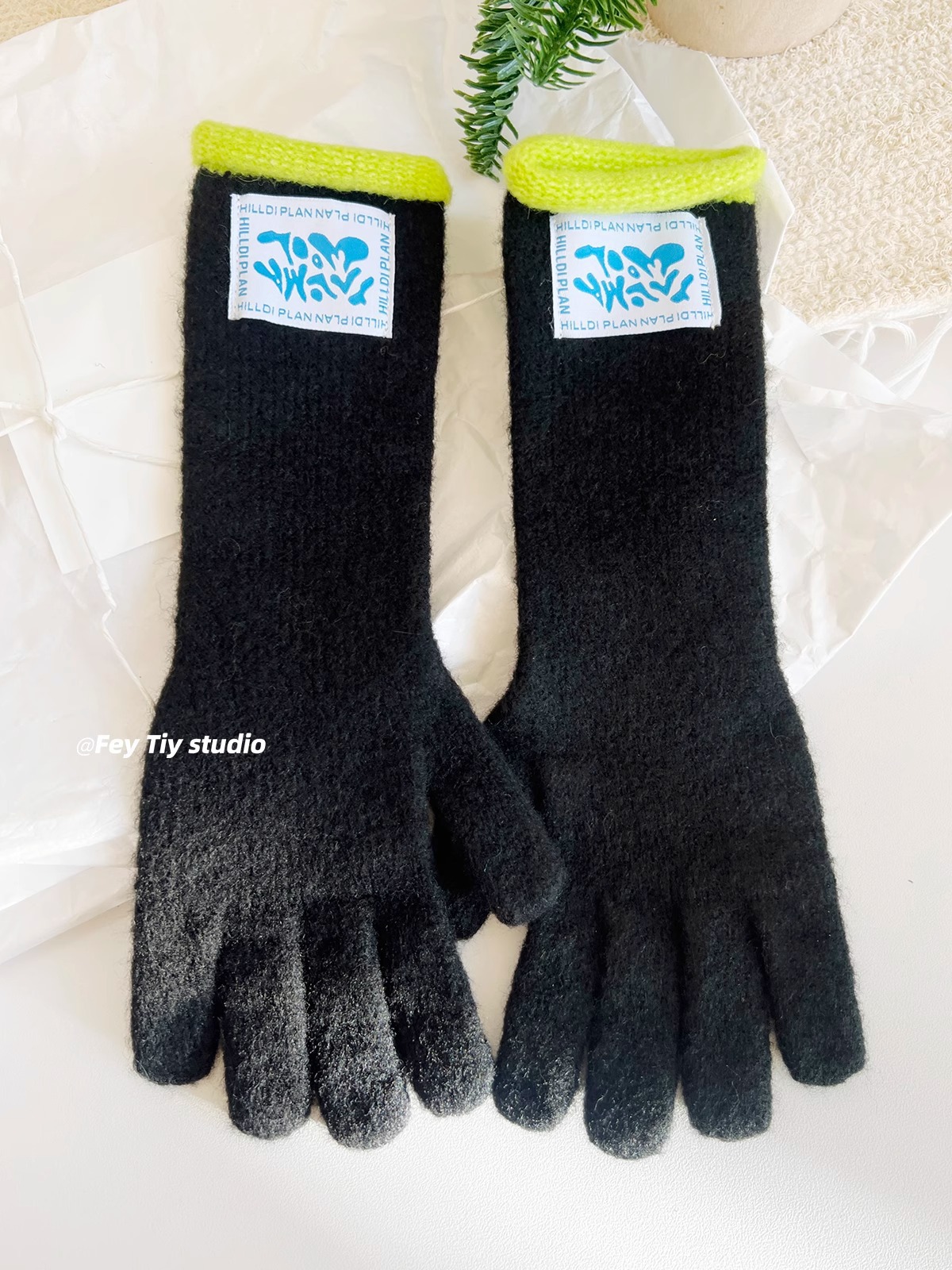 韩系中长款带标卷边保暖手套女 可触屏多巴胺y2k针织骑行漏指手套