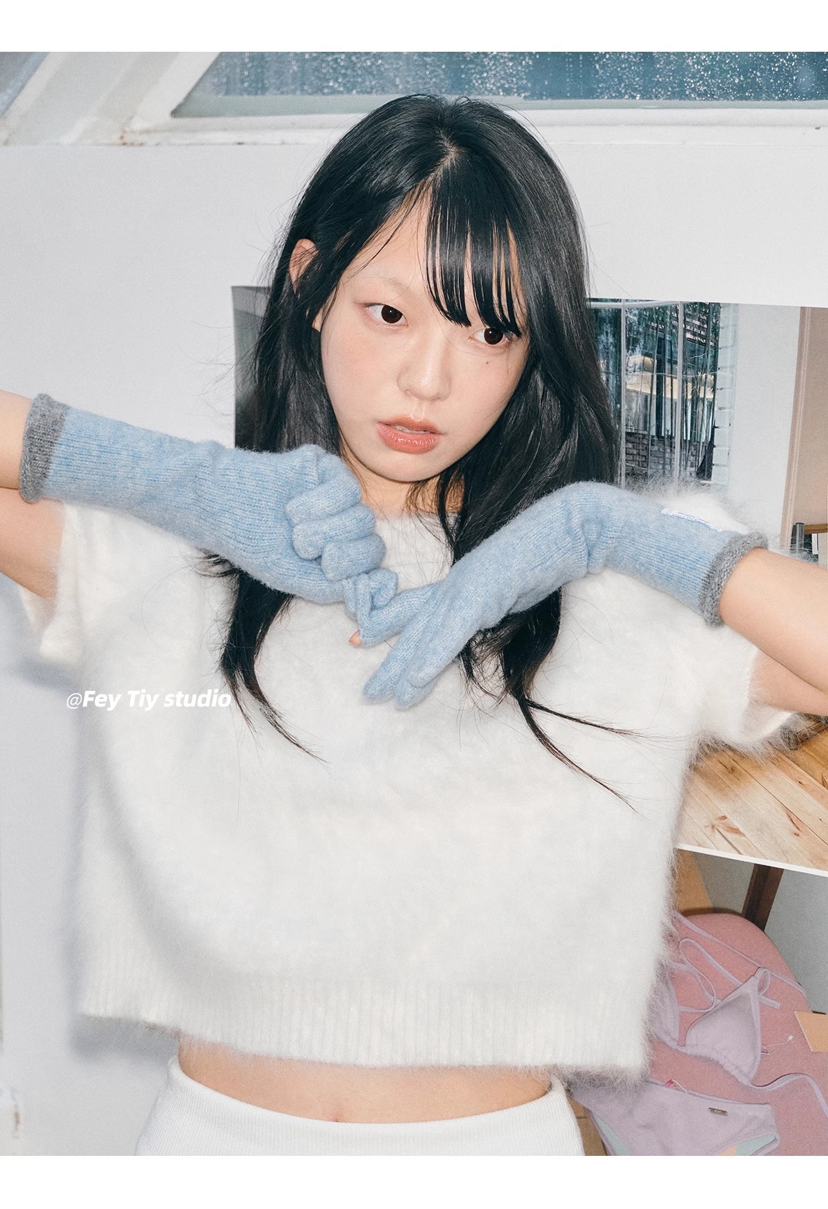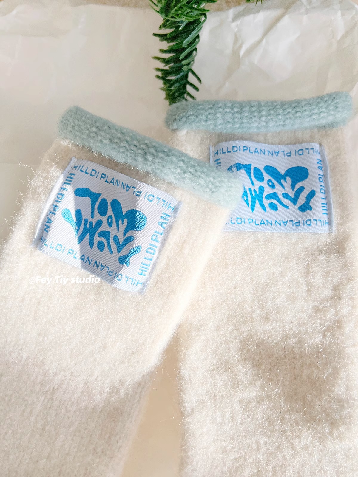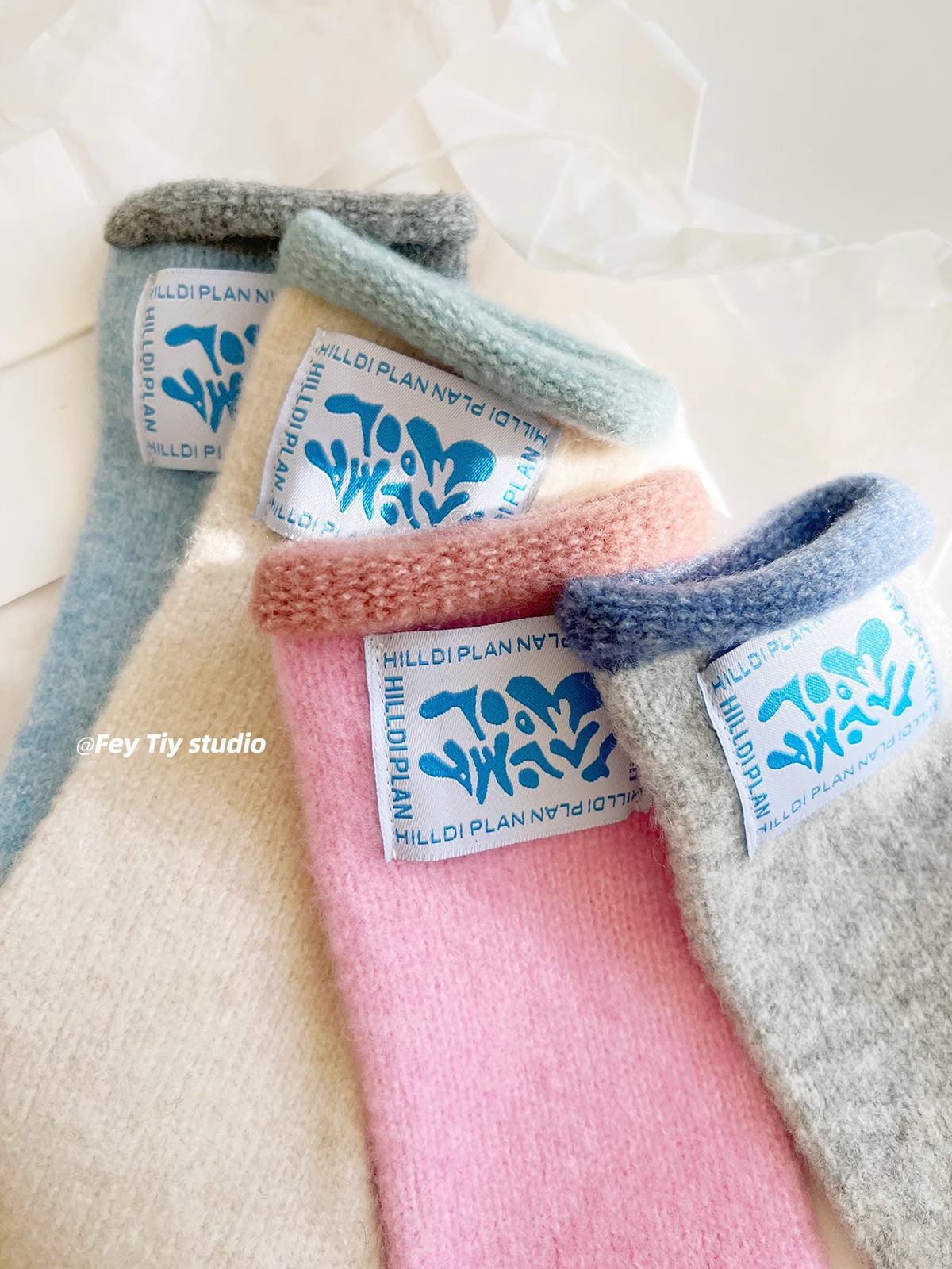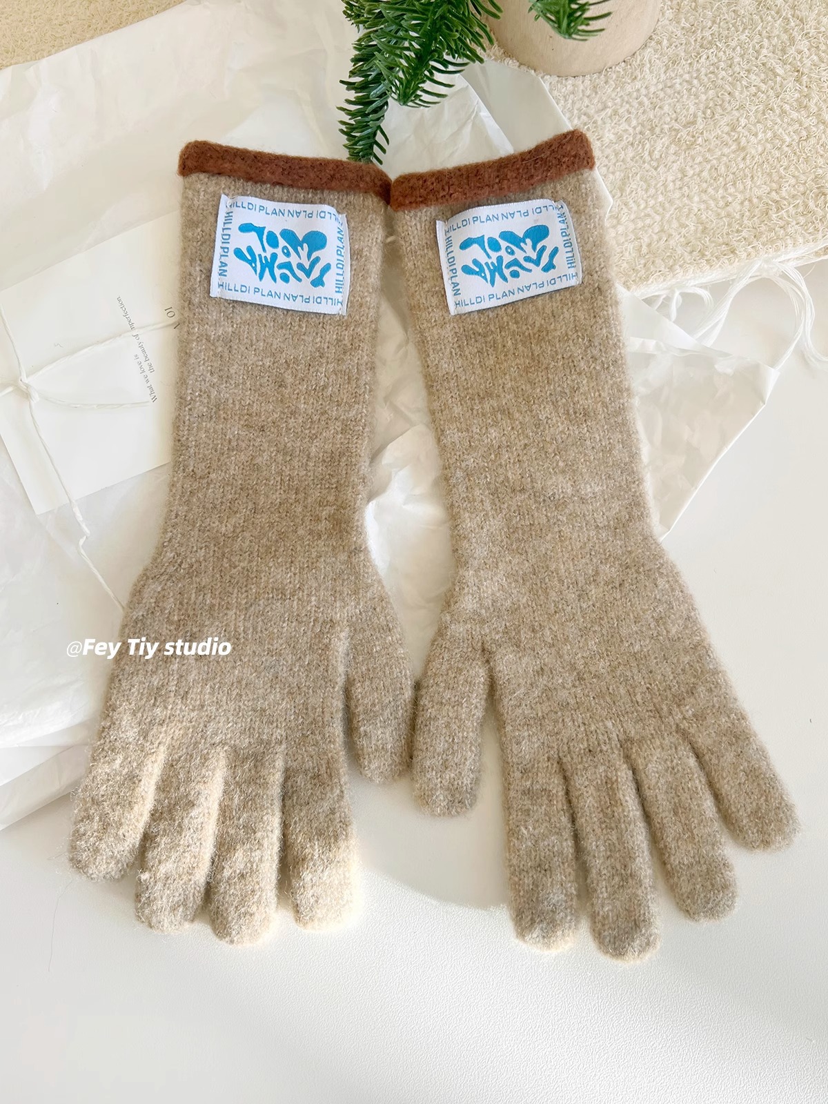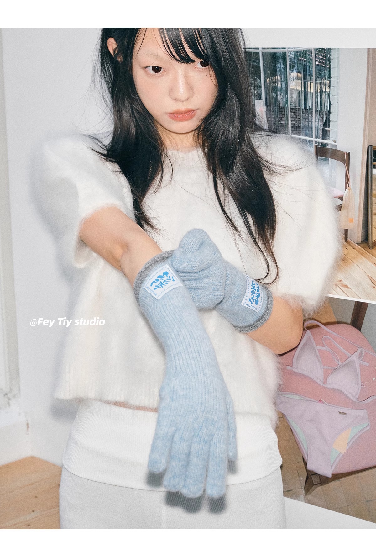 韩系中长款带标卷边保暖手套女 可触屏多巴胺y2k针织骑行漏指手套