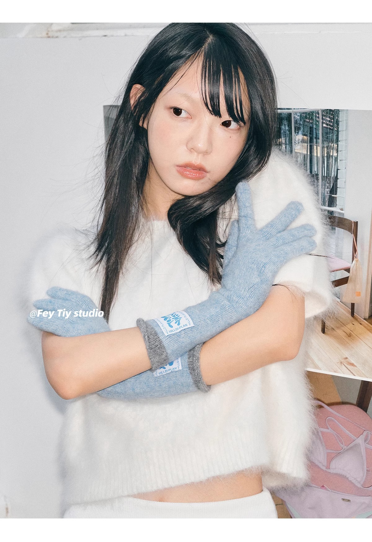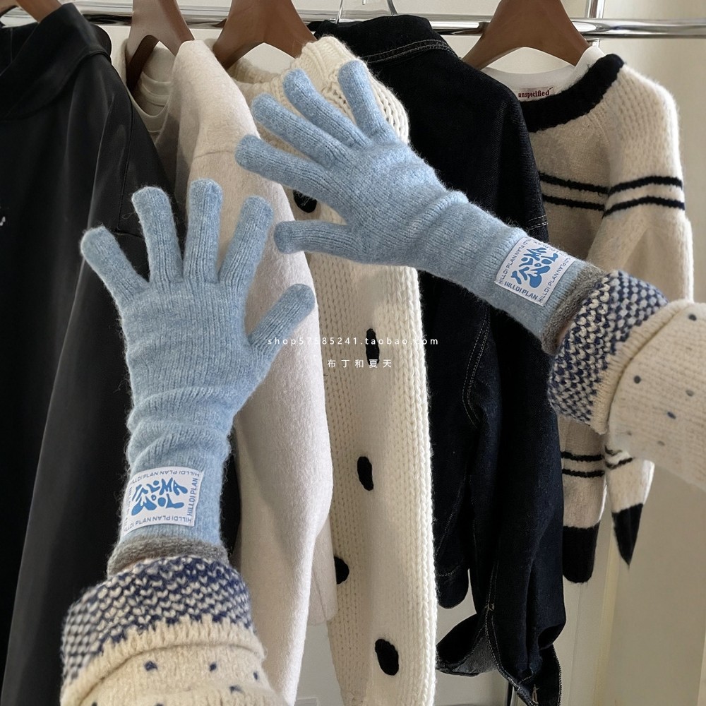 韩国订单~韩系博主同款点子纱针织毛线手套百搭保暖五指骑行手套