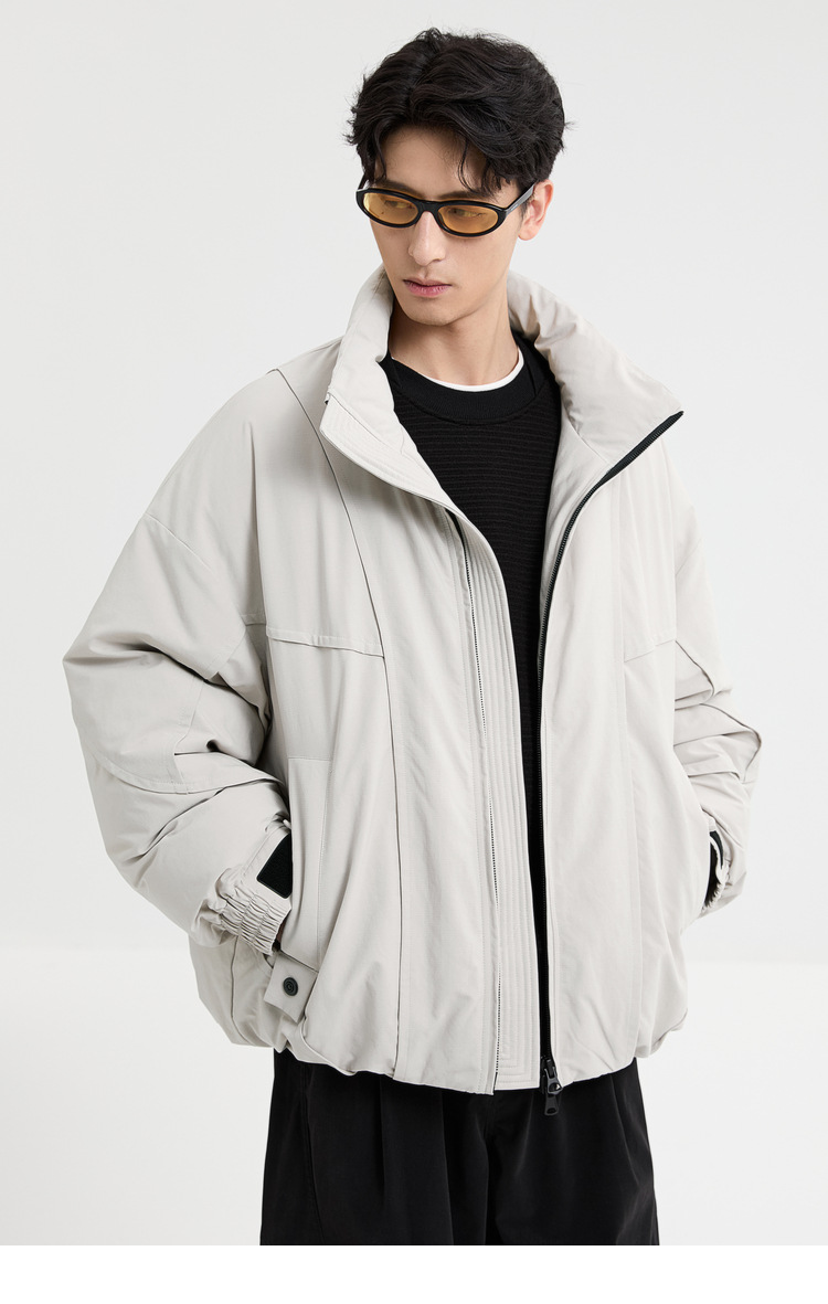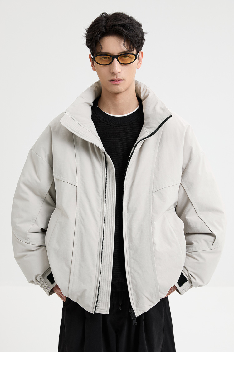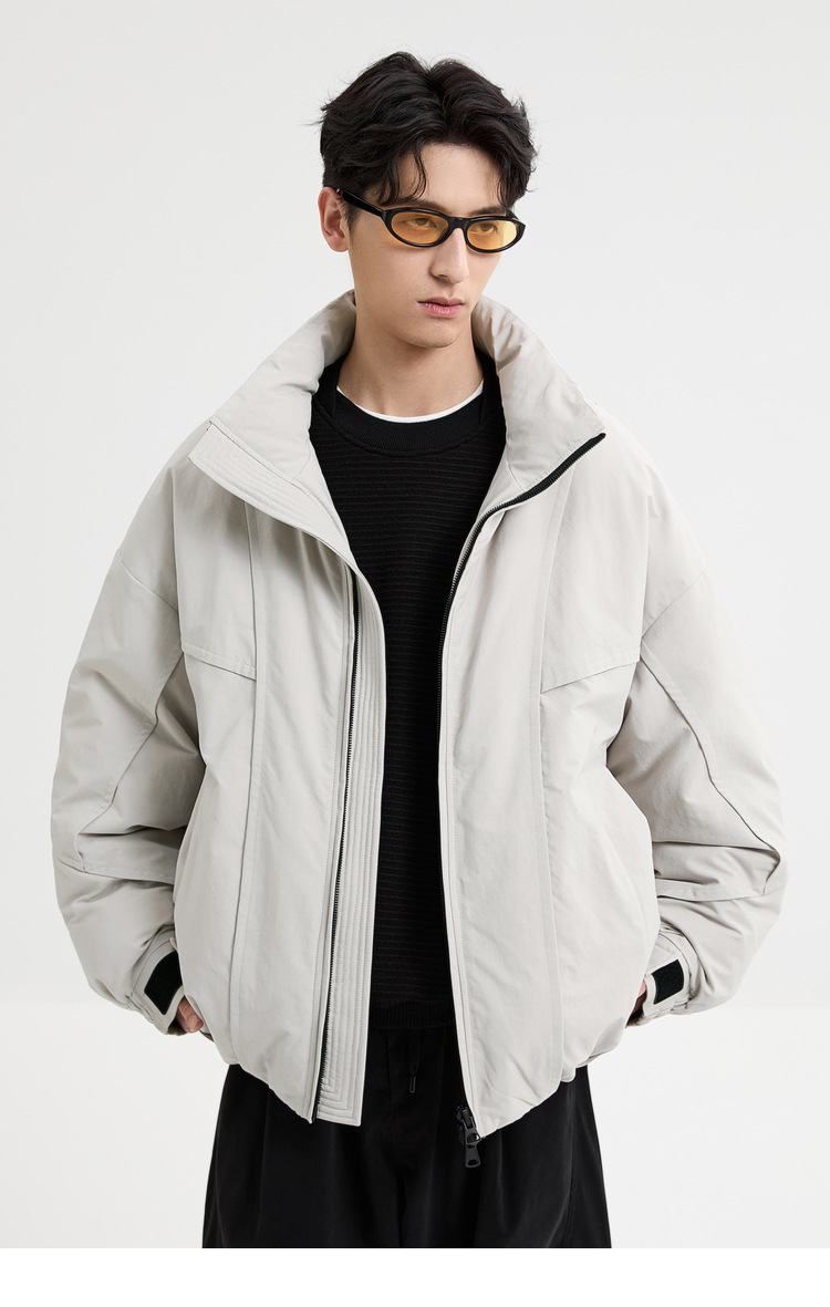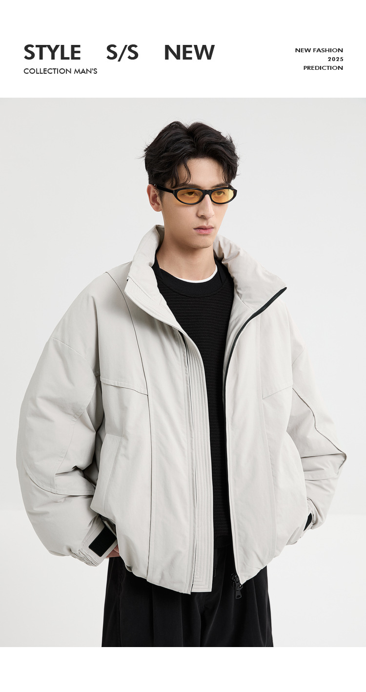 2025针织短款轻薄廓形松弛立领毛衣羽绒服男高级感灰色压印潮外套