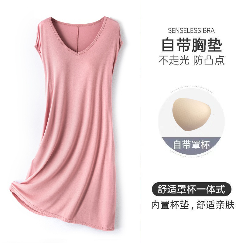 モーダルノースリーブワンピース女性の夏のロングスカートの大きいサイズの薄いタイプの胸パッド付きの寝スカートのポケットはスカートを着ることができます。