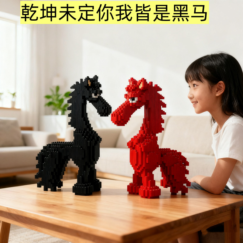 2026新款天选黑马积木拼图小颗粒拼装模型高难度摆件礼物毛绒玩具