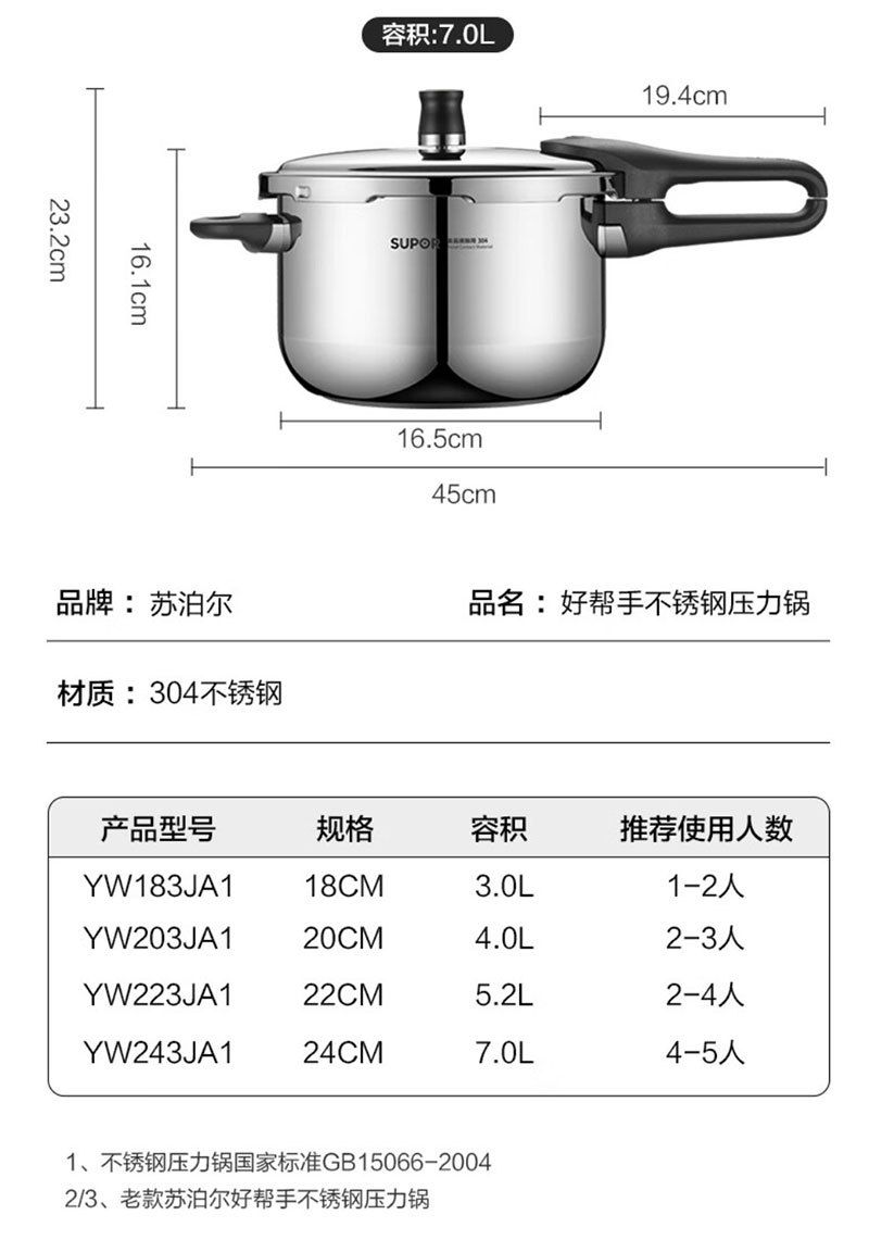 蘇泊爾304ステンレス高圧鍋家庭用ガス電磁炉通防爆圧力鍋YW223/243JA1