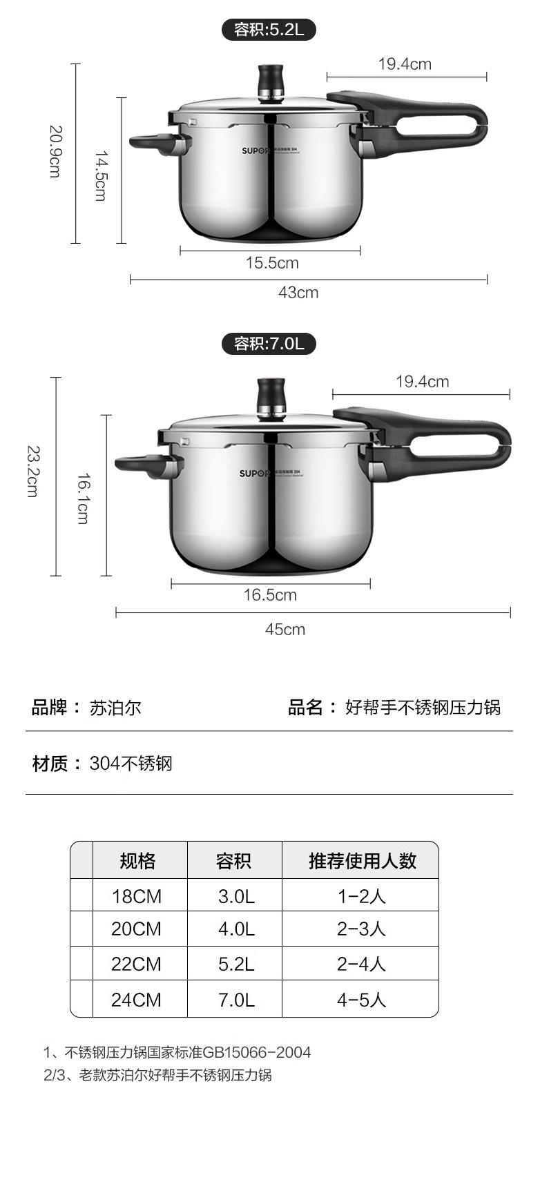 蘇泊爾藍眼高圧鍋家庭用304ステンレス圧力鍋複底ガス電磁炉通用YW22S1