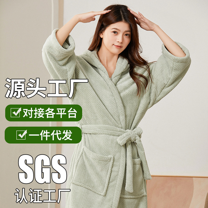 秋冬季加厚成人浴袍女珊瑚绒睡衣情侣加长款大码浴衣舒适睡袍保暖