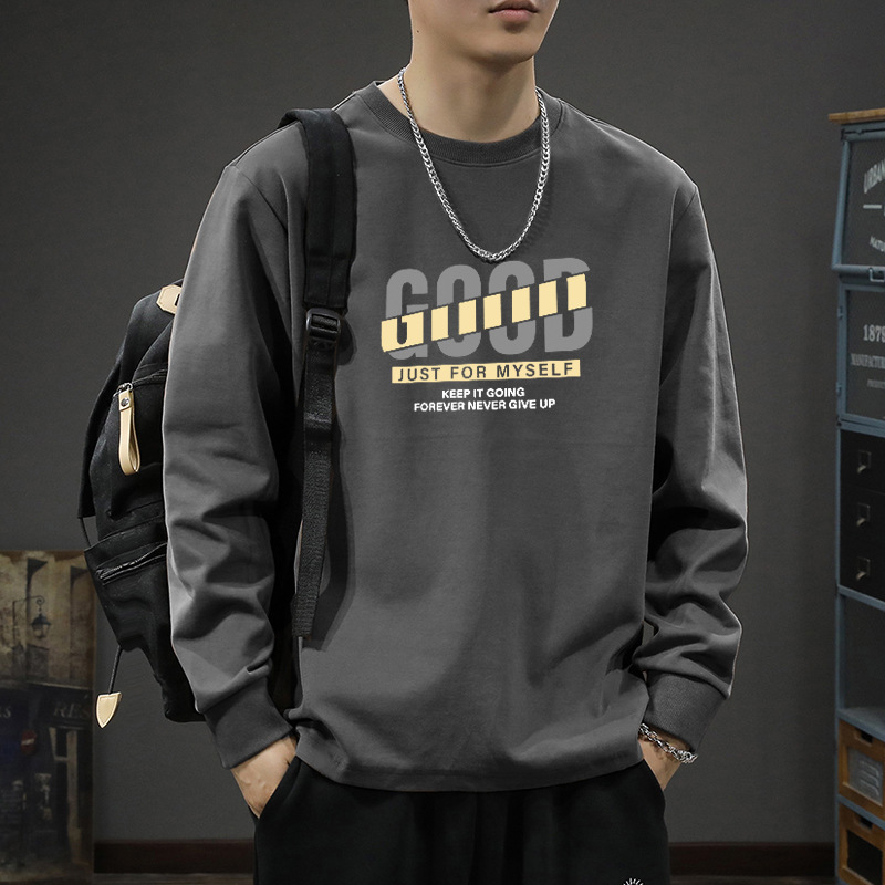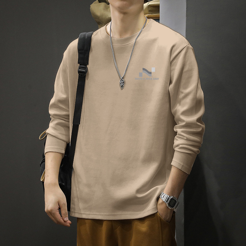 新款重磅纯棉长袖T恤男宽松圆领纯色春秋内搭休闲打底衫图案时尚