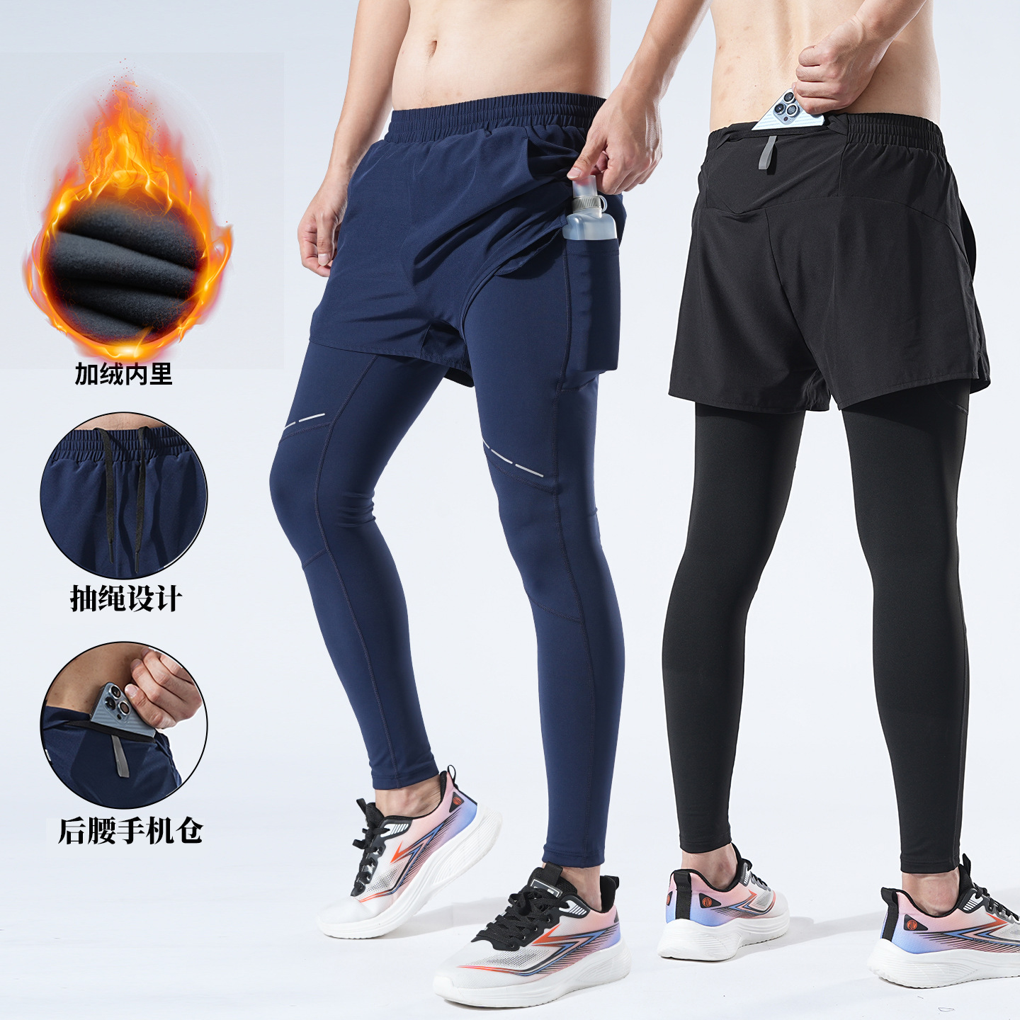 跑步长裤男马拉松压缩裤假两件双层加绒裤子运动健身训练可放手机