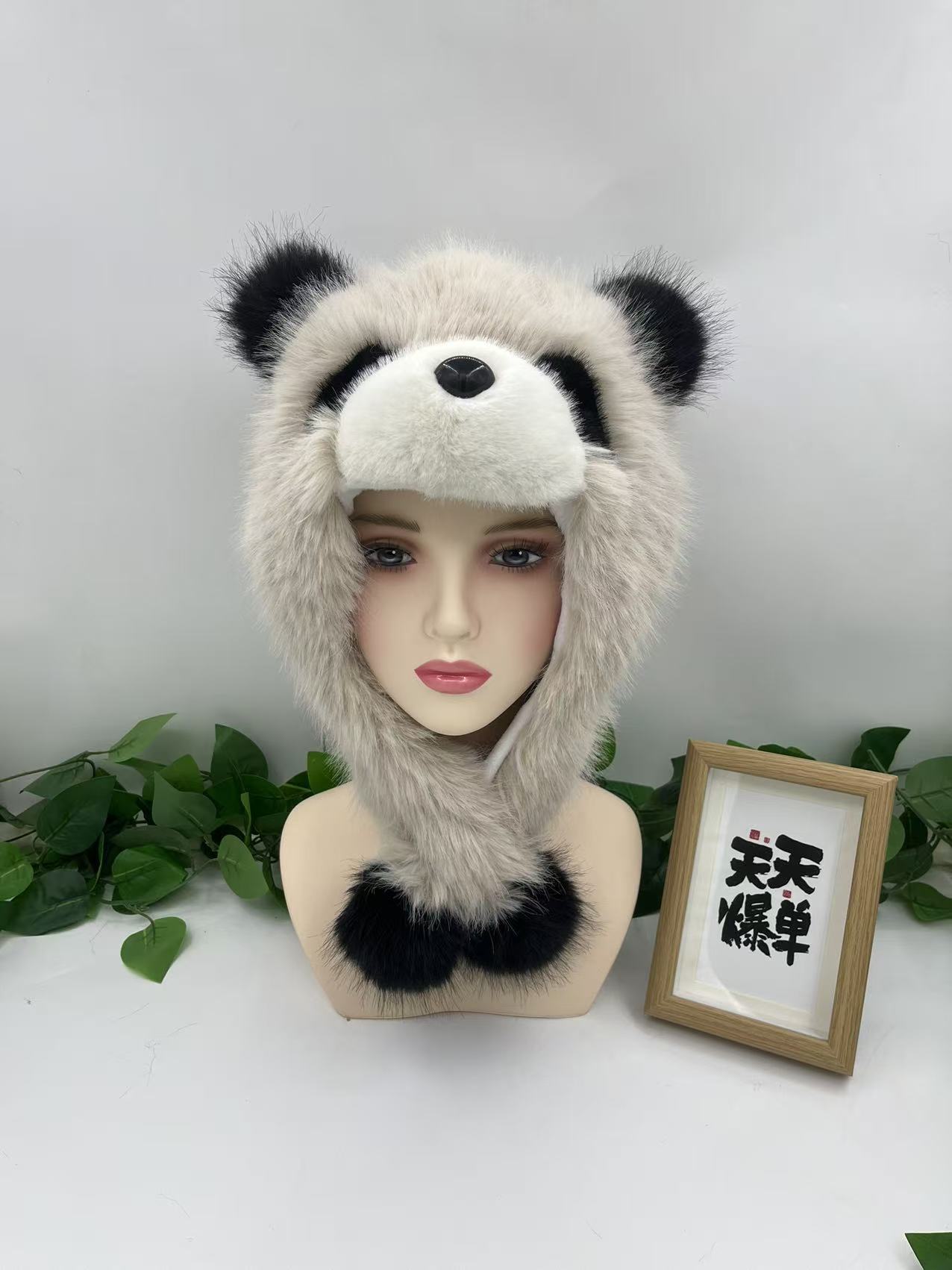 跨境爆款秋冬季 正版可爱熊猫帽 一体两件套 显脸小 卡通护耳 毛
