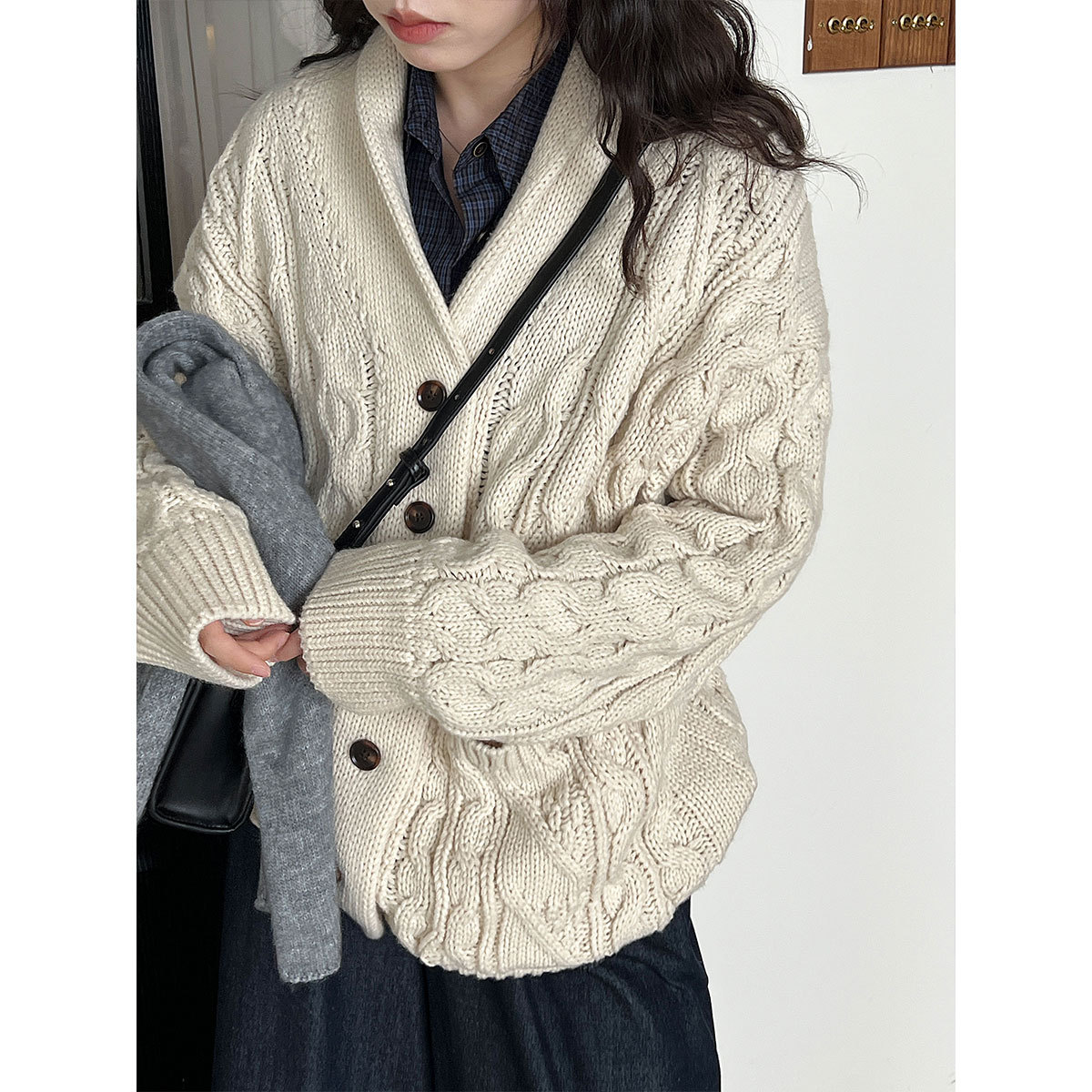 鹿西 法式粗针织复古慵懒风毛衣外套女2025秋冬牛角扣开衫ss880