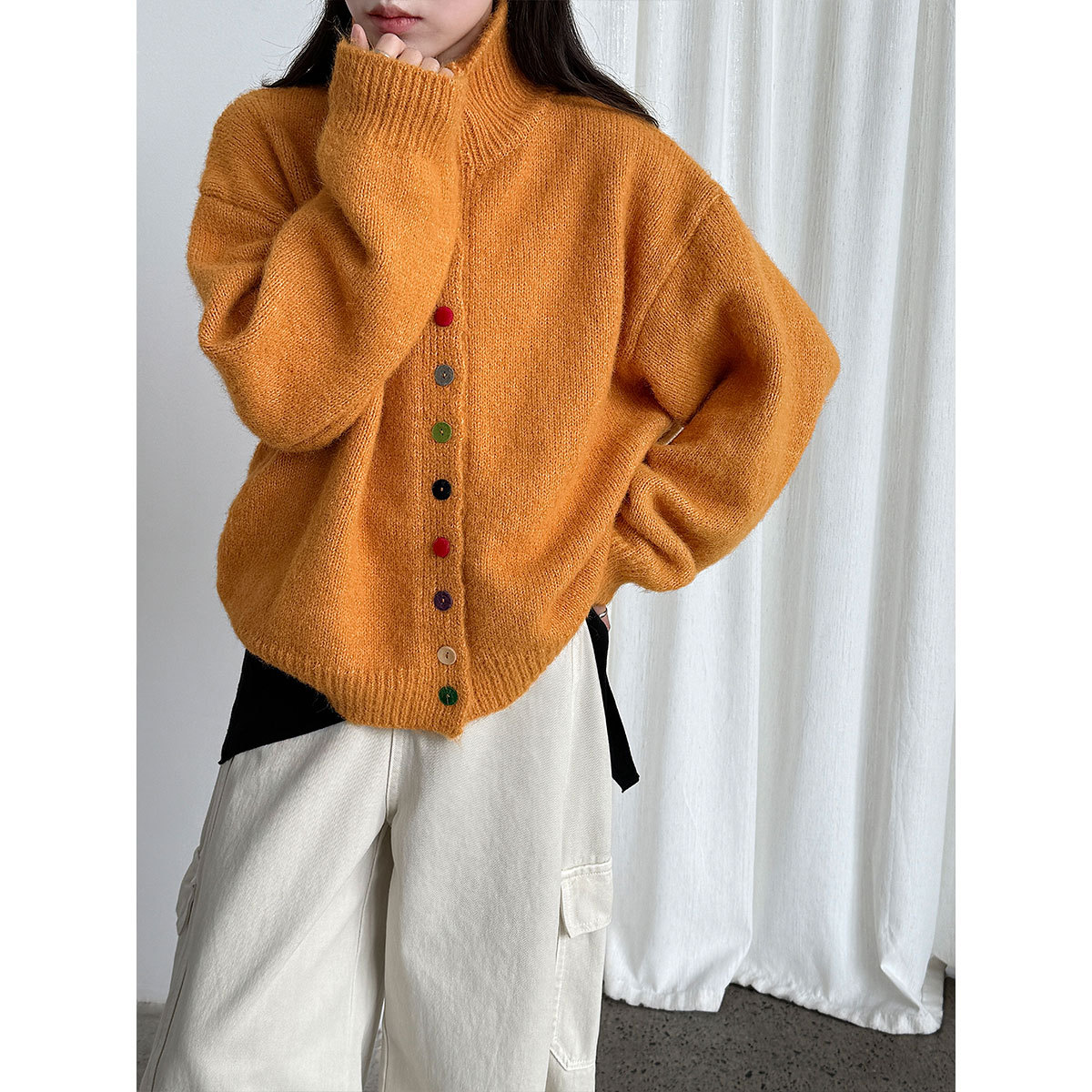 鹿西 韩系设计感彩色纽扣立领毛衣外套女软糯羊毛针织开衫厚ss847