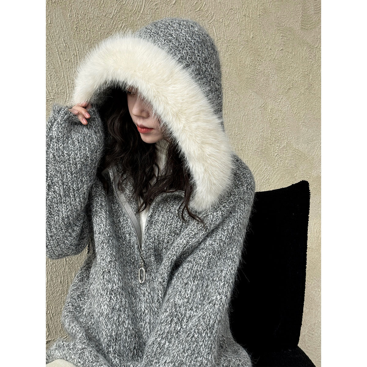 鹿西 羊毛慵懒风可拆卸毛领针织外套女秋冬软糯连帽毛衣开衫ss904