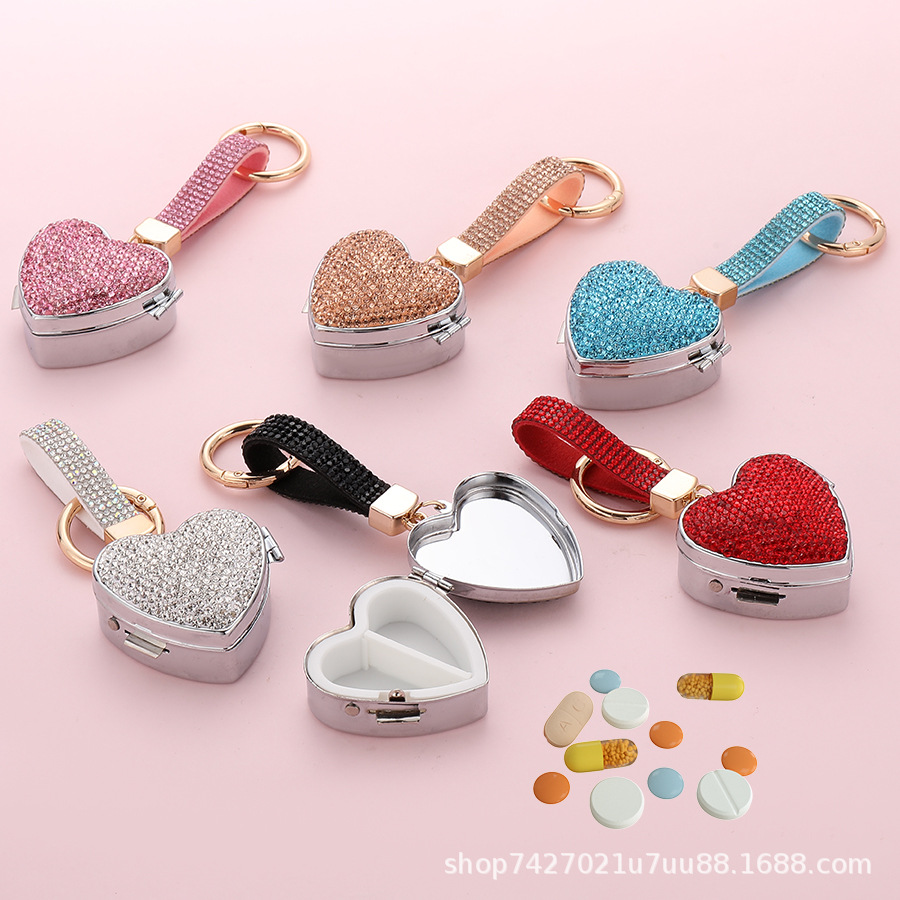 新款镶钻便携爱心药盒钥匙扣女包包挂件汽车钥匙扣挂件配首饰盒