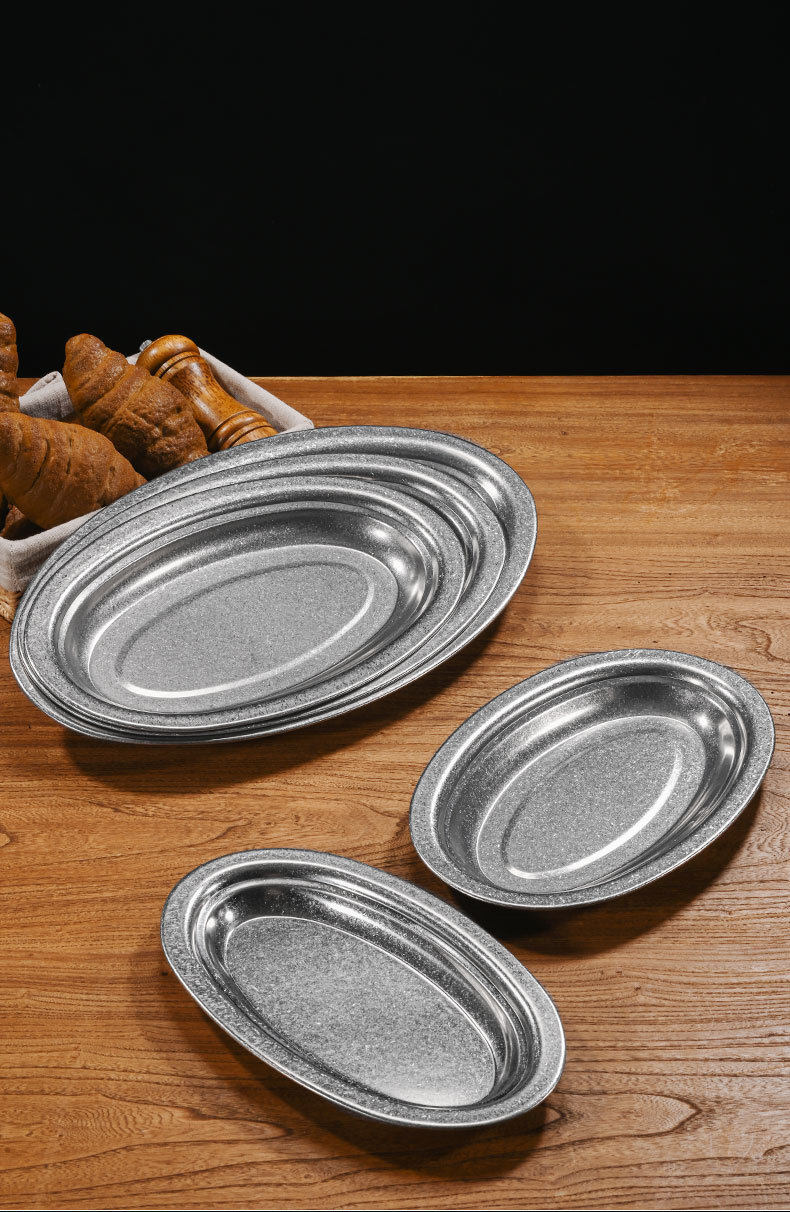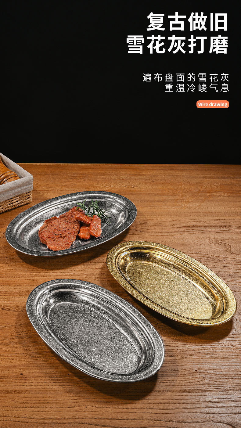 复古不锈钢椭圆盘平底加厚蛋形盘商用餐厅烤肉烧烤盘菜盘蒸鱼盘
