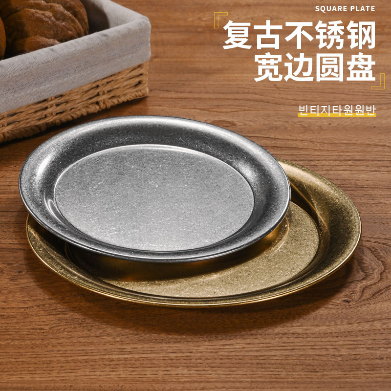 复古不锈钢宽边圆盘商用做旧托盘平底盘餐厅烧烤烤肉浅盘甜品盘子