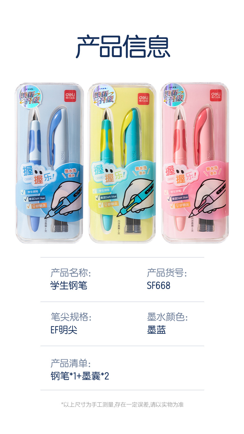得力SF668易水洗钢笔EF明尖软胶护套学生学习练字用钢笔内赠墨囊