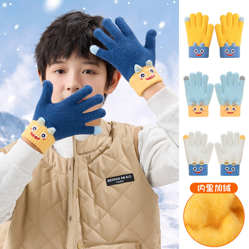 かわいい漫画風子供用女の子用毛糸製五本指学生用ニット暖かい男の子用防寒サイクリング用暖かい大きな子供用手袋