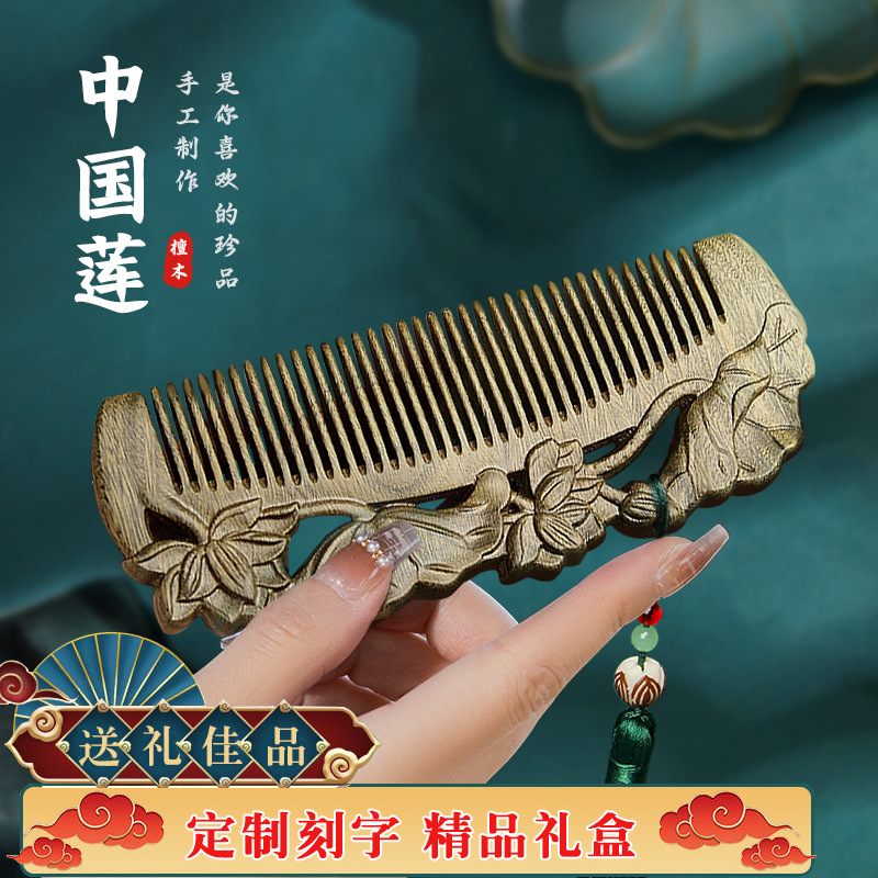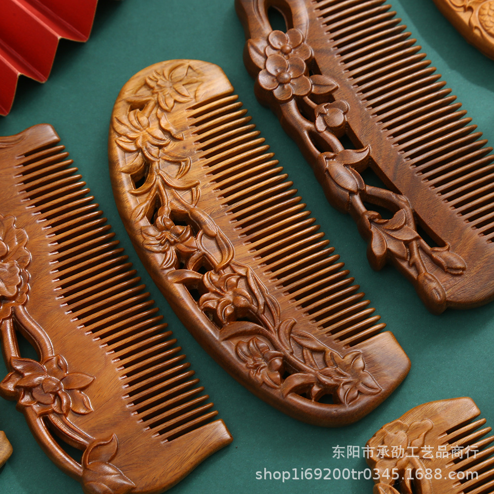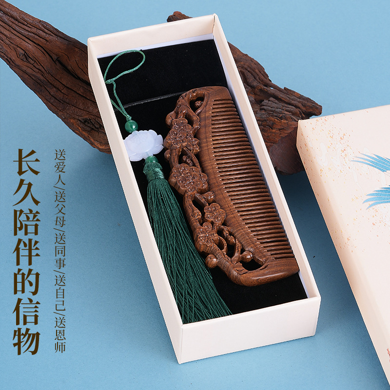 雕花绿檀木梳子雕刻梳子浮雕梳檀香木经络梳子礼盒装送礼生日礼物