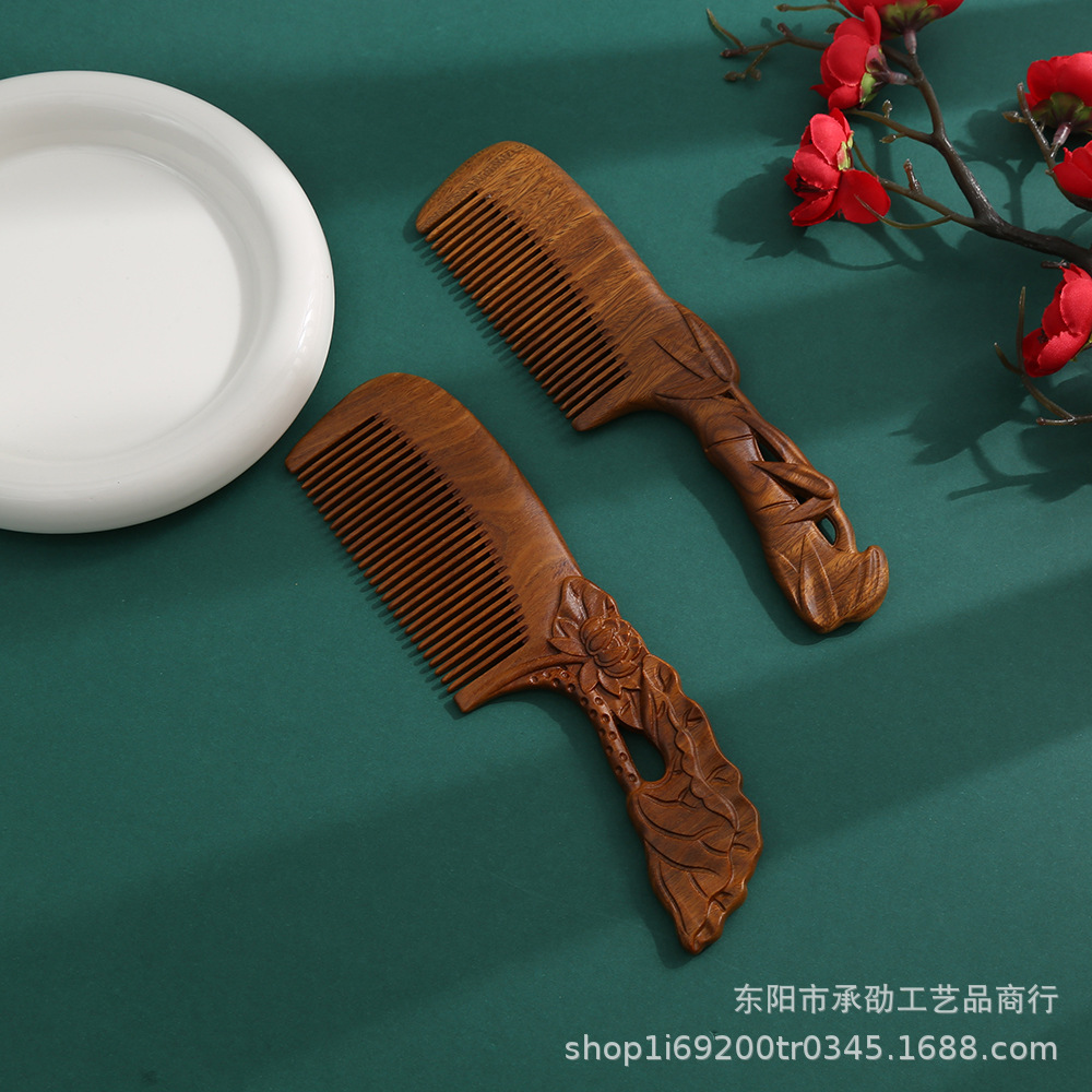 天然绿檀木雕花梳子雕刻梳子檀木梳子节日送人顺发美发梳长发女士
