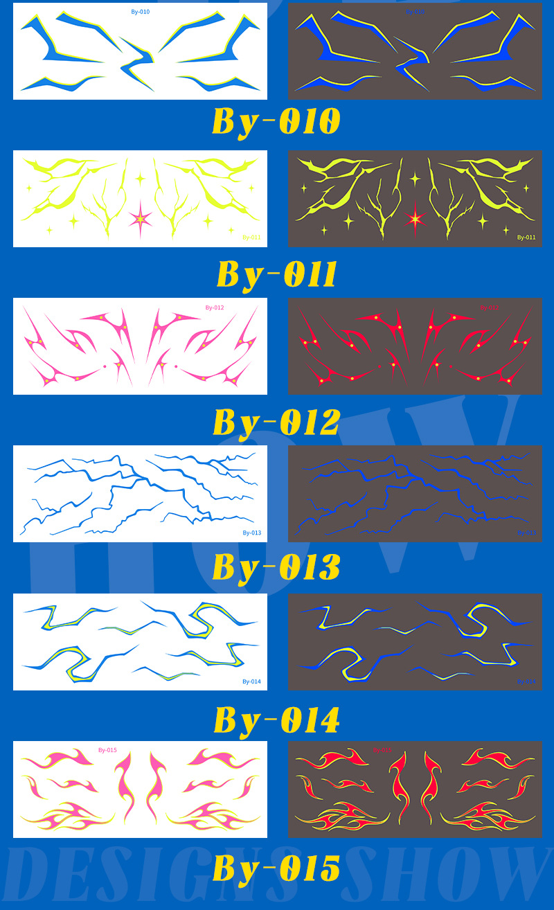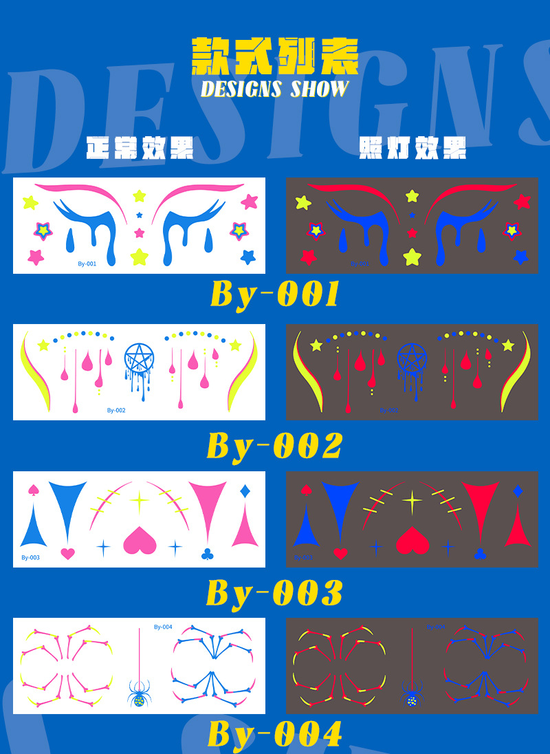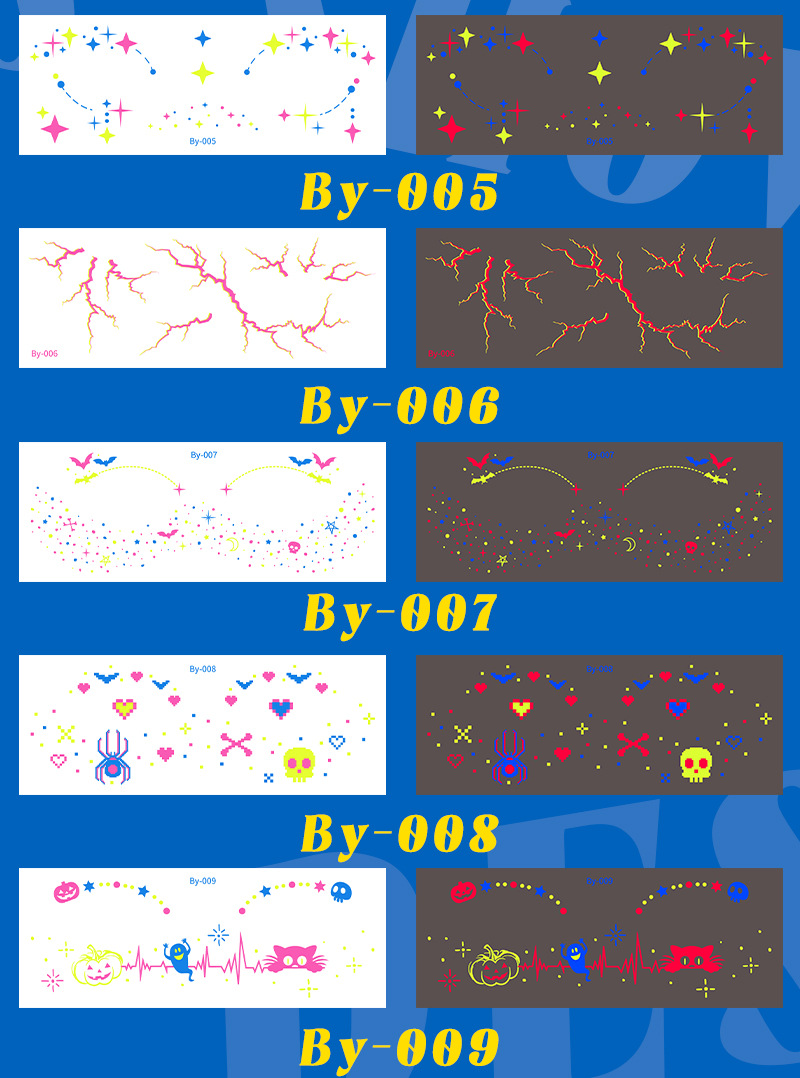 图案 By-001(荧光脸贴),By-002(荧光脸贴),By-003(荧光脸贴),By-004(荧光脸贴),By-005(荧光脸贴),By-006(荧光脸贴),By-007(荧光脸贴),By-008(荧光脸贴),By-009(荧光脸贴),By-010(荧光脸贴),By-011(荧光脸贴),By-012(荧光脸贴),By-013(荧光脸贴),By-014(荧光脸贴),By-015(荧光脸贴)
