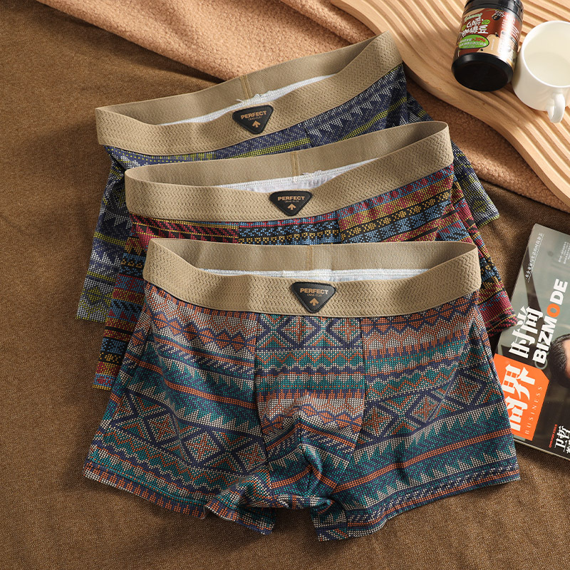 一件代发 民族风男士内裤纯棉平角裤男生运动复古印花四角裤 P812