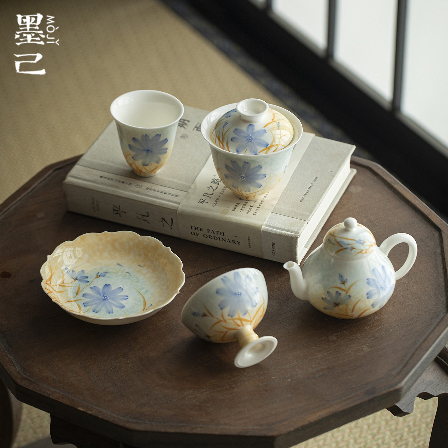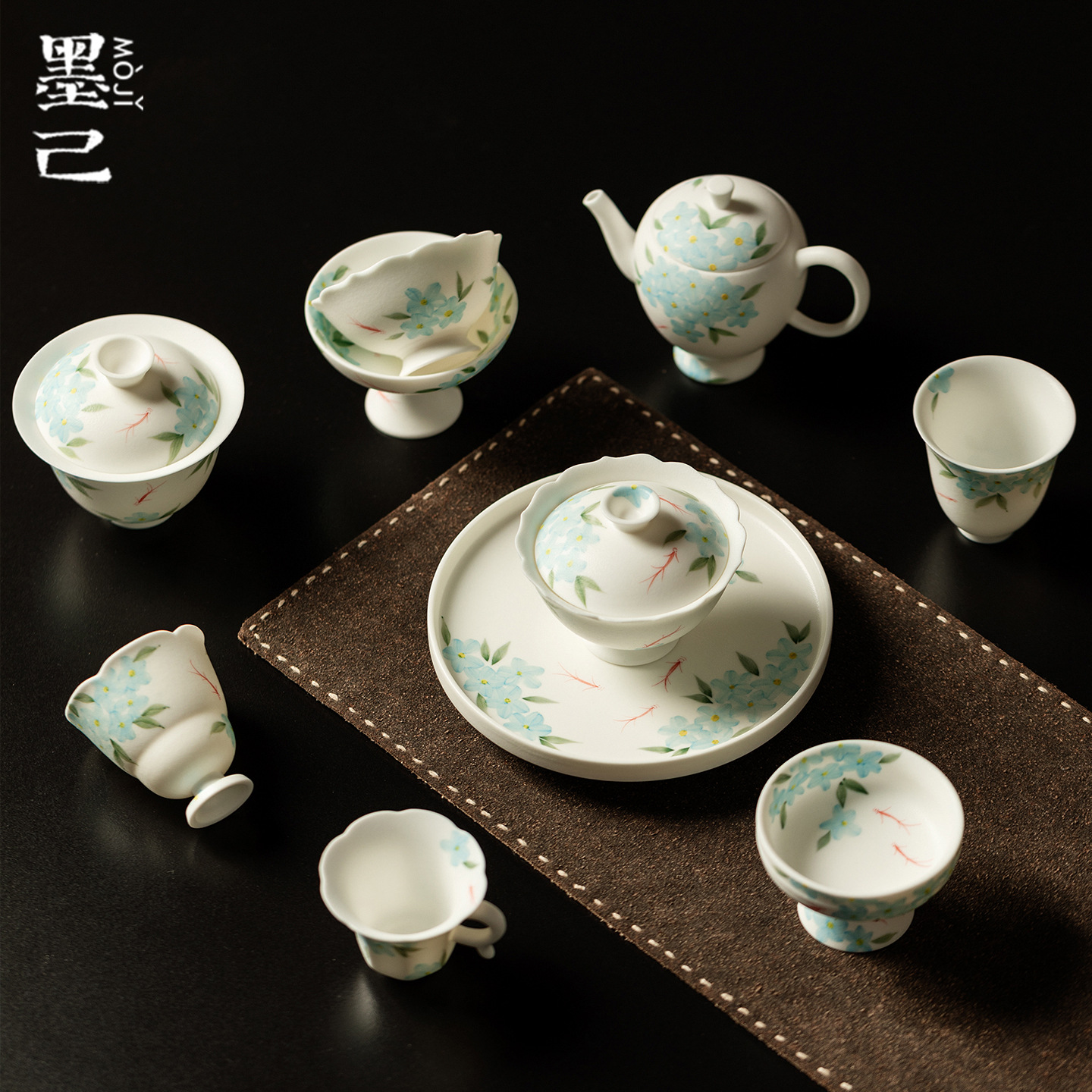 墨己雪花白蓝芳鲤影手绘哑光功夫茶具家用茶壶盖碗主人杯壶承茶杯