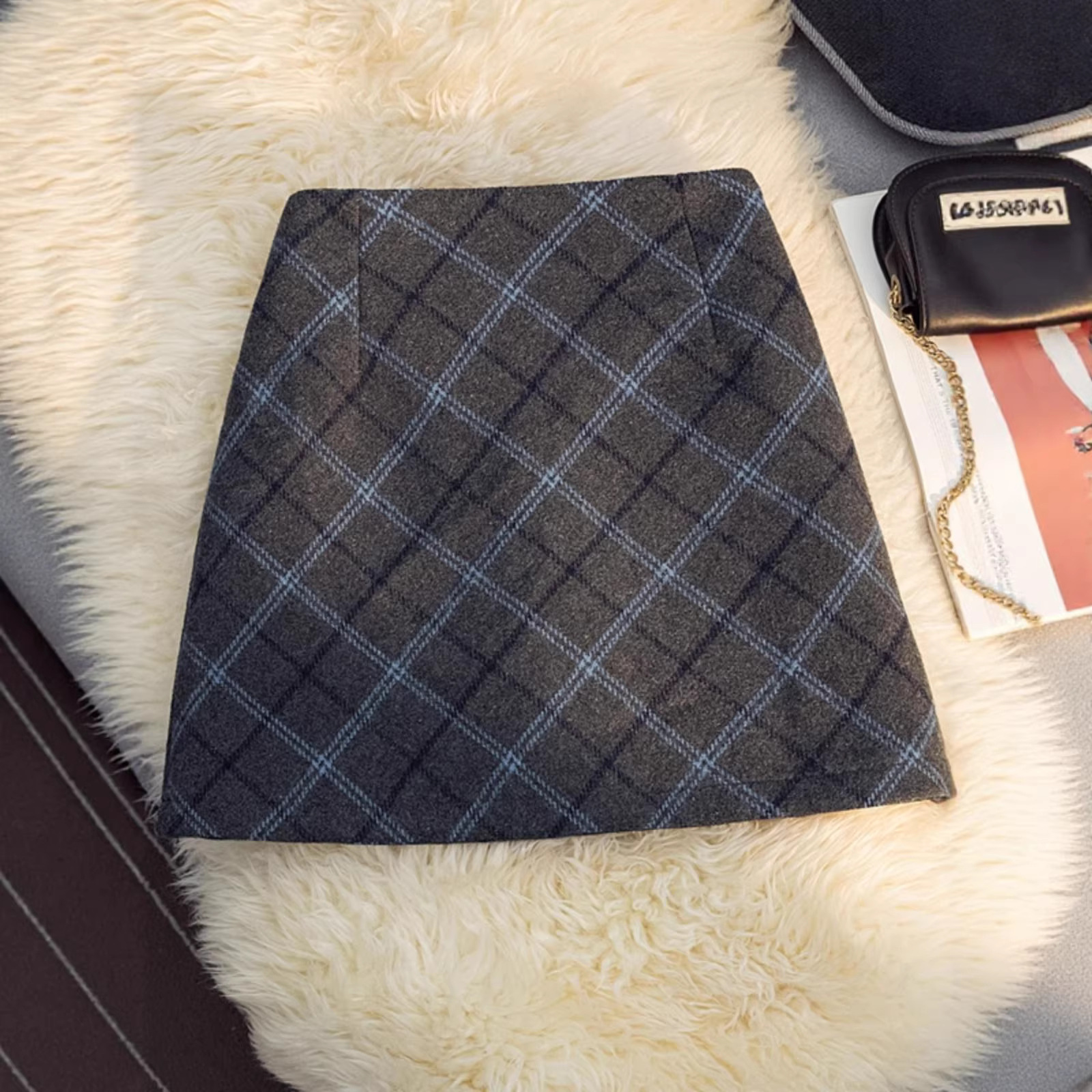 UNMUN美式复古格纹毛呢半身裙女秋冬新款设计感高腰a字包臀裙灰色