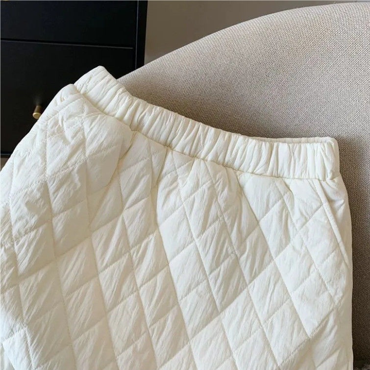 2025年秋冬向け、アウターとしても着用できる白の菱形柄コットンスカート。厚手で暖かい綿入り、露出防止、Aライン、ヒップを包み込むショートスカート。