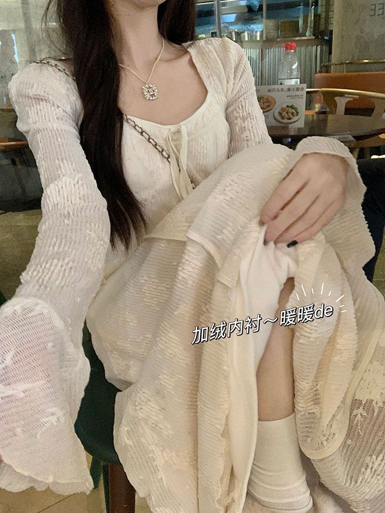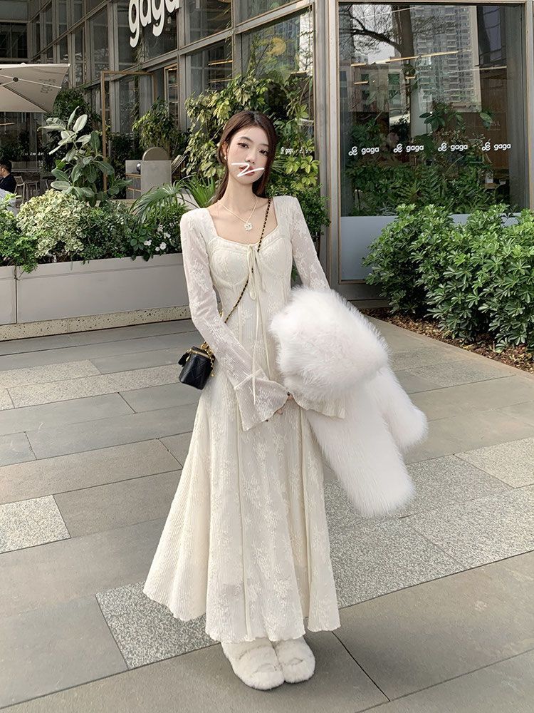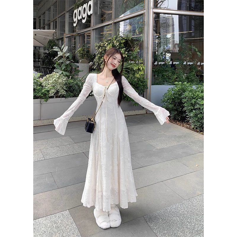 温柔风蕾丝刺绣连衣裙新款女秋冬加绒加厚法式气质内搭长裙子