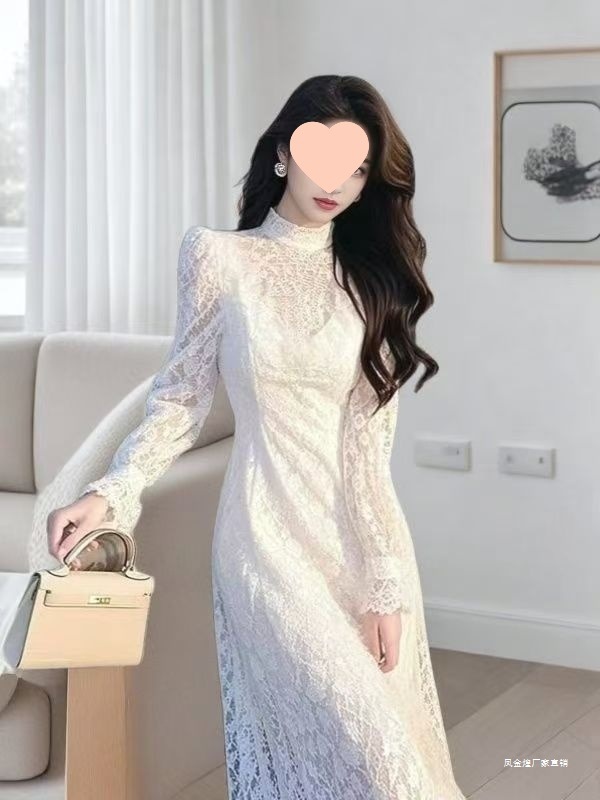 感白色半高领蕾丝连衣裙女秋冬2025新款气质轻奢收腰长裙裙子